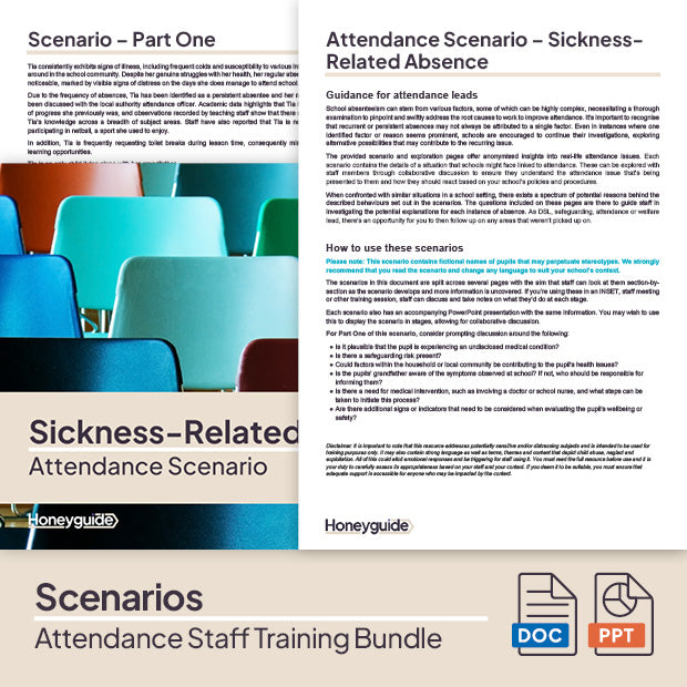 The resources in this bundle are also available in the Attendance Strategy, Monitoring and Training Pack, which contains so much more - it's got full guidance, resources for whole-school attendance strategy plus templates to help uncover the barriers to an individual pupil's attendance in order to create attendance intervention plans. If you're looking for a resource to support the bigger picture of attendance across the school, we'd highly recommend it, plus it's the best way for schools to get value for money too: