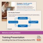Presenter training notes are built into the PowerPoint to support you when delivering it to staff. With examples, behaviour management scenarios and thoughtful questions, the training PowerPoint allows for collaboration and sharing between staff members so you can be sure everyone's on the same page when it comes to knowing the strategies to use to avoid group sanctions.