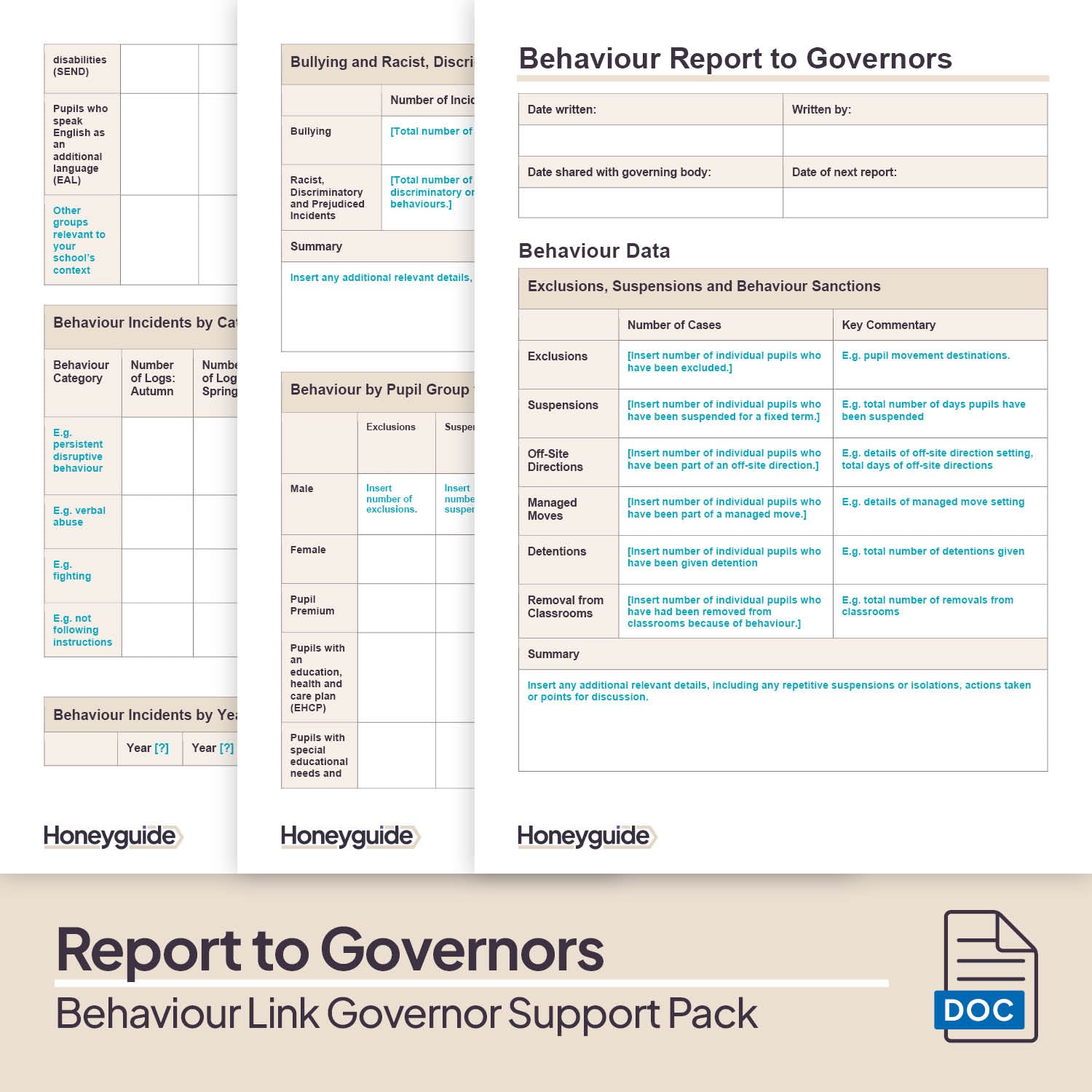 2. Behaviour Report to Governors - This document is designed to support school leaders and the behaviour link governor to report to their full governing board. It contains sections for both behaviour data (such as exclusions, suspensions and bullying data) and commentary about the school's current position, giving all school governors insight.