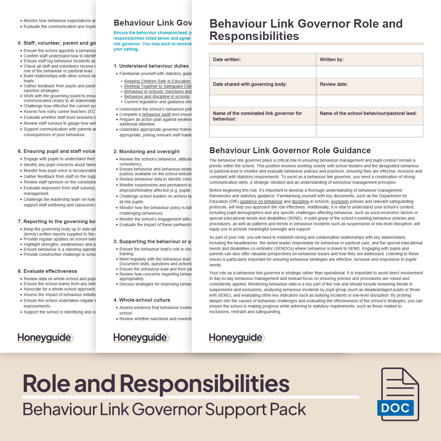 3. Behaviour Link Governor Role and Responsibilities - This document outlines the key parts of a behaviour governor's role and what areas of school governance they are responsible for. It can be used as-is or amended to reflect what your school needs from its behaviour and attitudes link governor. Either way, it's a helpful document that allows a new behaviour governor to understand what they need to do.