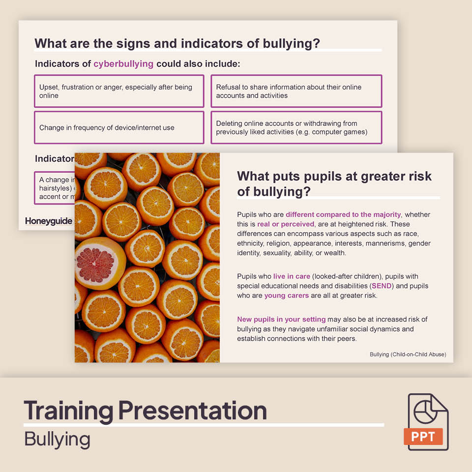 1. Staff Training Presentation - Bullying: A ready-to-deliver 28-slide PowerPoint presentation that outlines the signs and indicators of bullying, including cyberbullying and prejudice-based and discriminatory bullying, followed by slides that allow staff to consider and discuss what puts pupils at greater risk, other factors to be aware of and what actions they should take. The presentation has built in discussion questions and finishes with a scenario and quiz to check staff understanding about bullying.