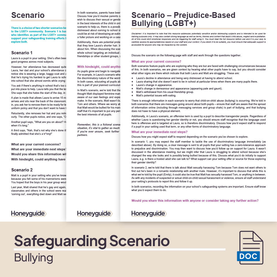 2. Scenarios - Bullying /  Prejudice-Based and Discriminatory Bullying (LGBT+): Two editable scenarios that outlines fictional situations where bullying is occurring. Both include full commentary and guided considerations for the DSL or staff member leading the child protection training. Use them to gauge how effectively staff can identify the signs of abuse as well as how they'd respond in a real-life context, including further actions they'd take.