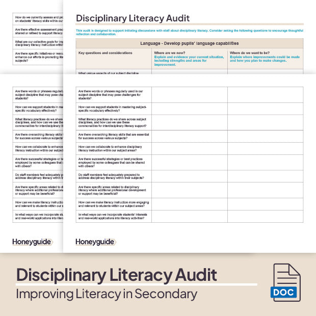 • Disciplinary Literacy - Audit - dig deeper in disciplinary literacy and how staff from different departments support the teaching of literacy through their subject specialisms. Duplicate and disseminate the audit to different subject teams, allowing them to consider how effectively they currently support your school's endeavours to improve literacy. (3-page document)