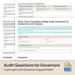 This flexible pack is perfect for curriculum link governors or anyone looking to support a curriculum governor with their role, such as headteachers, trust leaders, governance professionals, curriculum leads or a chair of governors. With six comprehensive, editable resources - a curriculum audit for governors, an EYFS audit for governors, an early reading and phonics audit for governors, a subject report to governors template, an EYFS report to governors template and a curriculum link governor roles and responsibilities document - this pack will support governors who are new to role or in cases where the curriculum governor needs more structure and support in order to be highly effective in their role.