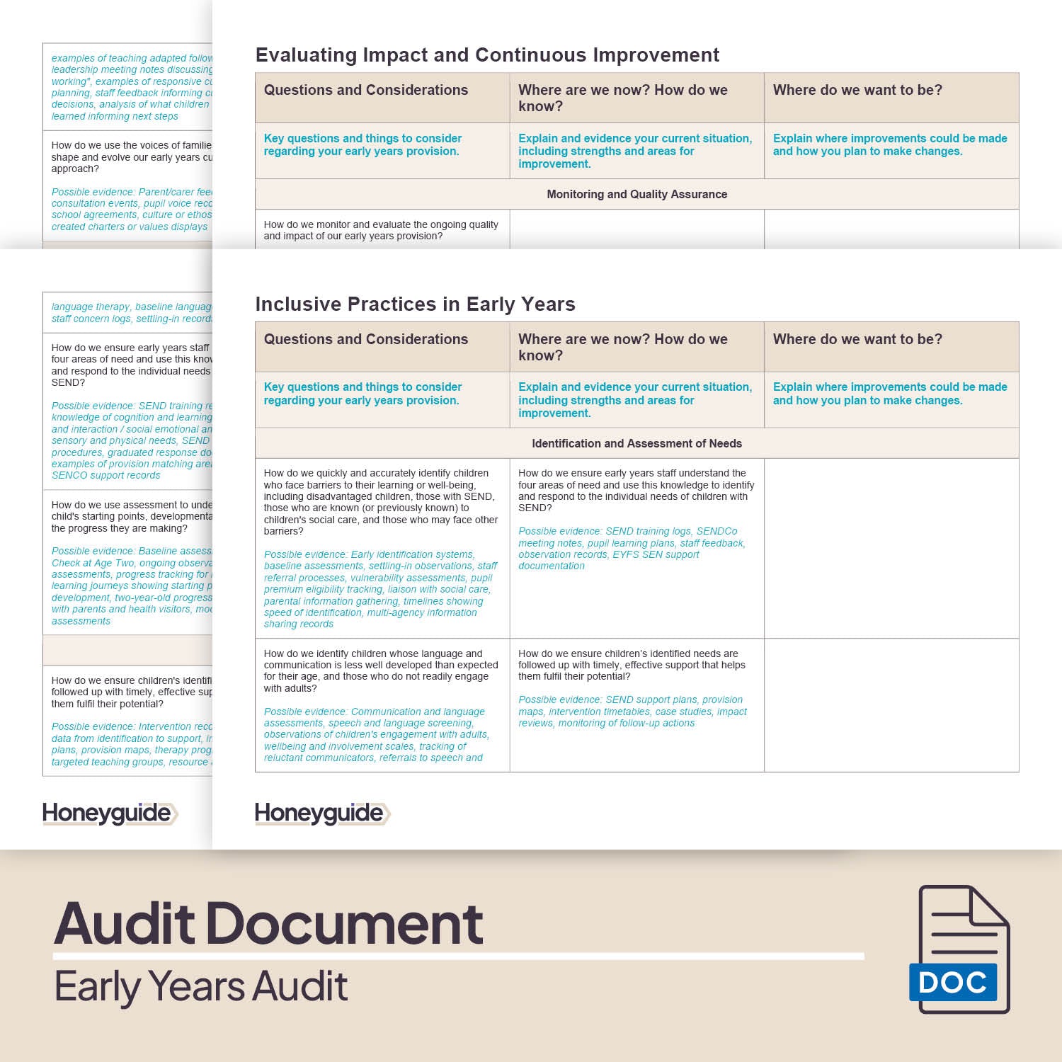 "How do I know if our early years teaching is supporting children's development effectively?" Specific audit sections focus on adult-child interactions, learning environment quality and assessment practices - helping you identify what's working and where improvements are needed.