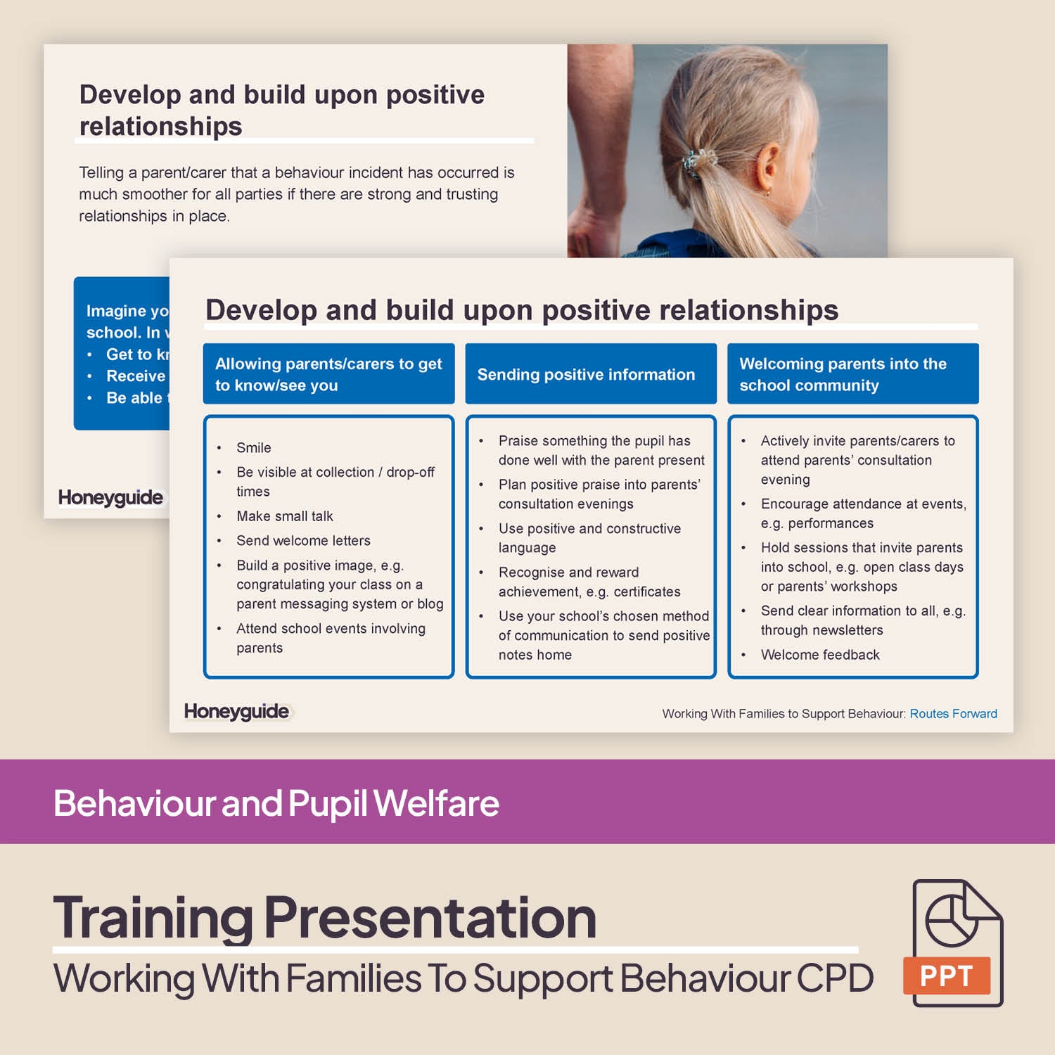 The 28-slide, ready-made PowerPoint is designed to last between 30 minutes to 1 hour and focuses on the benefits of building parent-teacher relationships. This then leads into how staff can use this positive home-school relationship to discuss a student's behaviour should issues arise.