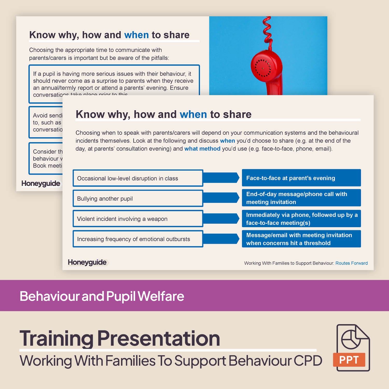 The session is perfect to reinforce messages about your school's behaviour policy and how you expect staff to communicate with parents and carers. It's particularly useful for those with less experience in behaviour management, such as ECTs, trainee teachers or other new staff who might find conversations with parents daunting, especially when having challenging conversations and discussing poor pupil behaviour.