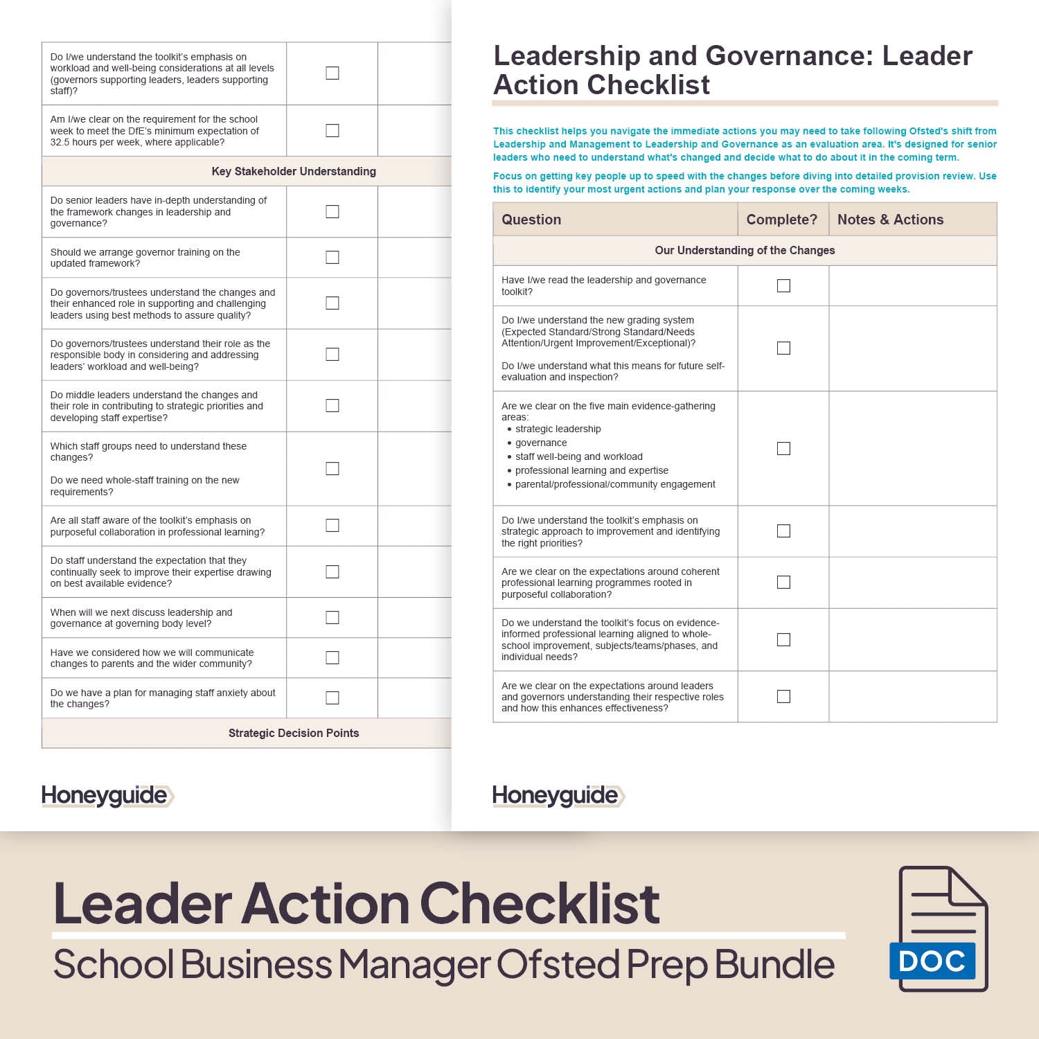 "What do I need to do to get myself ready for inspection scrutiny?" The Leadership and Governance Leader Action Checklist provides clear prompts for building your knowledge of how leadership and governance is inspected, with particular focus on resource management, compliance systems (including the single central record if relevant to your role), and operational effectiveness.