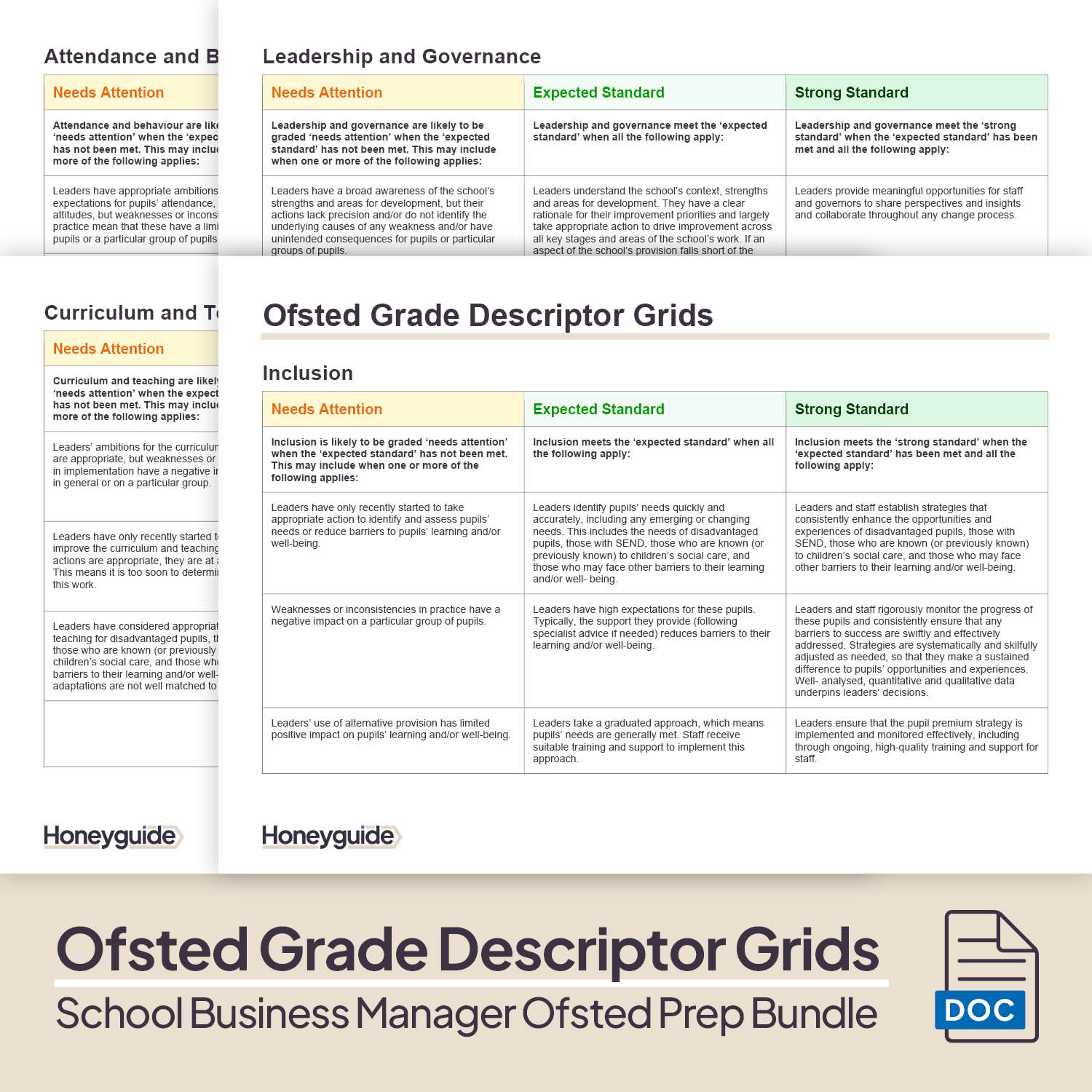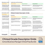 "Where does my work fit within the wider inspection framework?" The Ofsted Grade Descriptor Grids give you the complete toolkit in an editable format, highlighting not just the leadership and governance evaluation area but also where your work connects to safeguarding (particularly single central record compliance), inclusion (accessibility planning), and attendance and behaviour (operational systems).