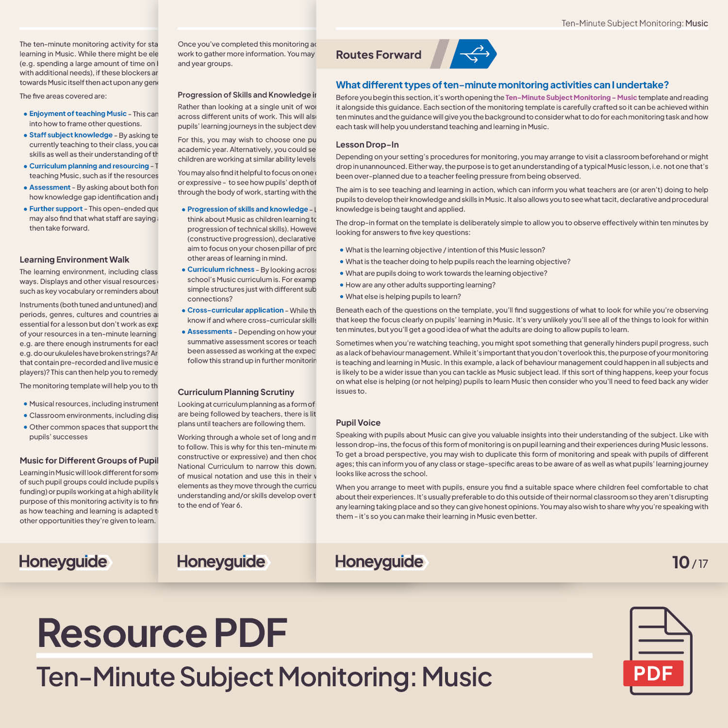 The guidance will walk you through what ten-minute subject monitoring is and how to find a time slot within your school day in order to conduct a short, sharp and focused monitoring session on Music. These activities can then be repeated in different classes or with different pupils across the term. It'll support you on how to conduct each type of subject monitoring activity, including: