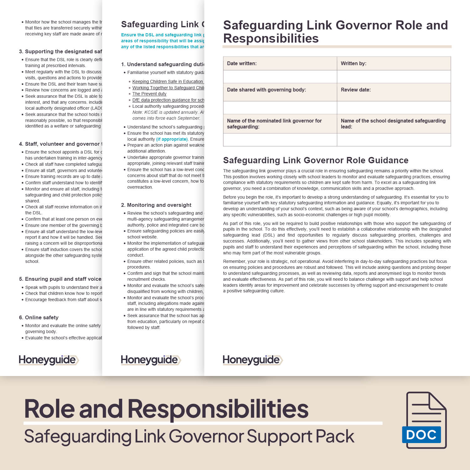 4. Safeguarding Link Governor Role and Responsibilities - This document outlines the key parts of a safeguarding governor's role and what areas of school governance they are responsible for. It can be used as-is or amended to reflect what your school needs from its safeguarding link governor. Either way, it's a helpful document that allows a new safeguarding governor to understand what they need to do.