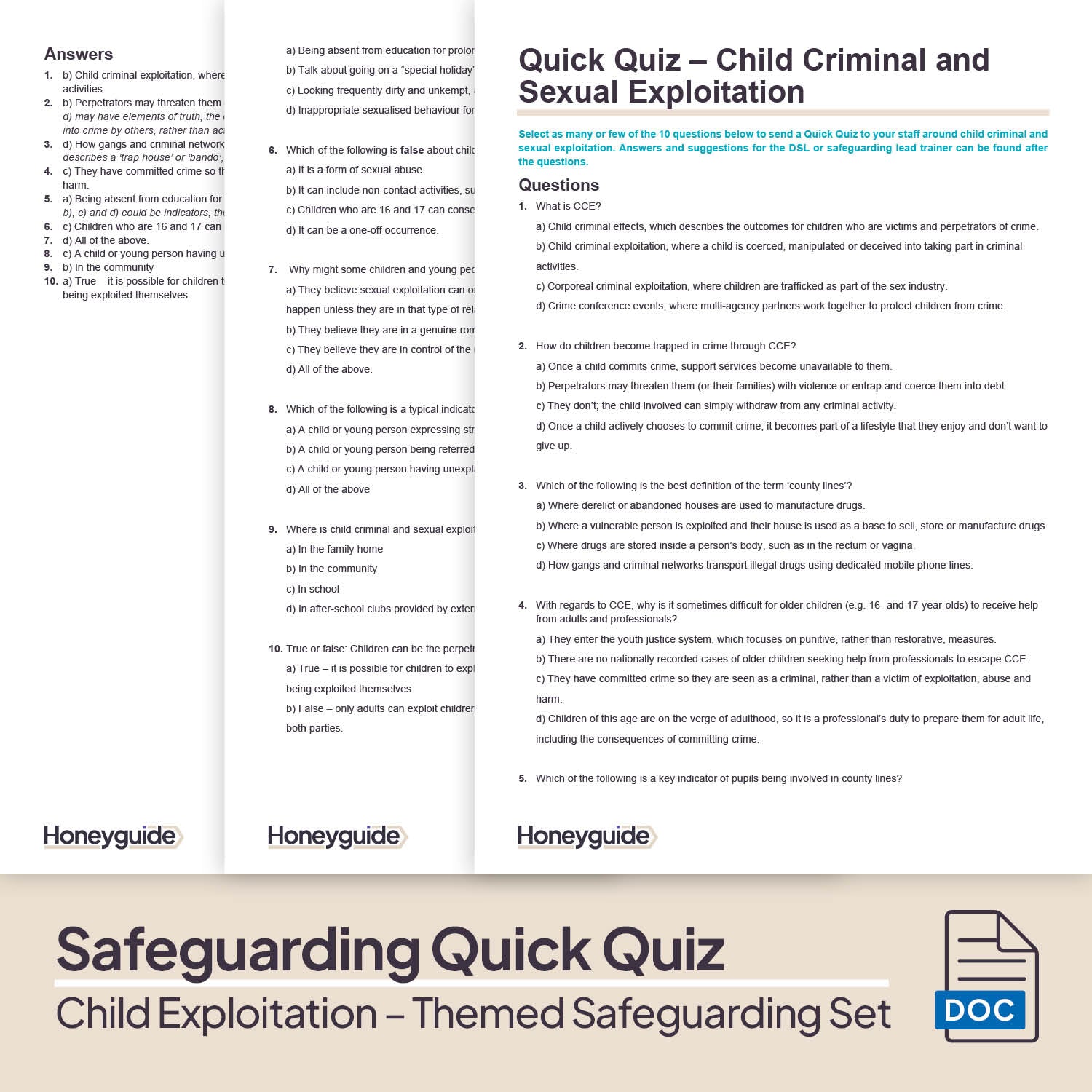 The Child Criminal and Sexual Exploitation quiz document is a 10‑question, editable multiple‑choice safeguarding quiz designed to check staff knowledge of CCE and CSE. The questions are realistic, with no easy answers, helping staff think critically about recognising grooming, coercion and exploitation. Suitable for both primary and secondary staff teams.