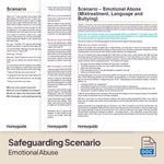 2. Scenario - Emotional Abuse (Mistreatment, Language and Bullying) / Emotional Abuse (Restrictive Parenting): Two editable scenarios that outline fictional situations where emotional abuse is occurring. It also includes full commentary and guided considerations for the DSL or staff member leading the child protection training. Use them to gauge how effectively staff can identify the signs of abuse as well as how they'd respond in a real-life context, including further actions they'd take.