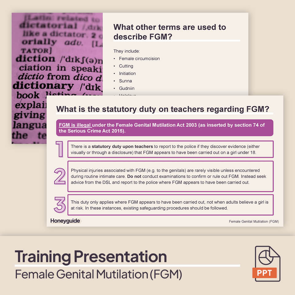 1. Staff Training Presentation - Female Genital Mutilation: A ready-to-deliver 24-slide PowerPoint presentation that outlines the signs and indicators of FGM, followed by slides that allow staff to consider and discuss what puts pupils at greater risk, other factors to be aware of and what actions they should take. The presentation has built in discussion questions and finishes with a scenario and quiz to check staff understanding about FGM.