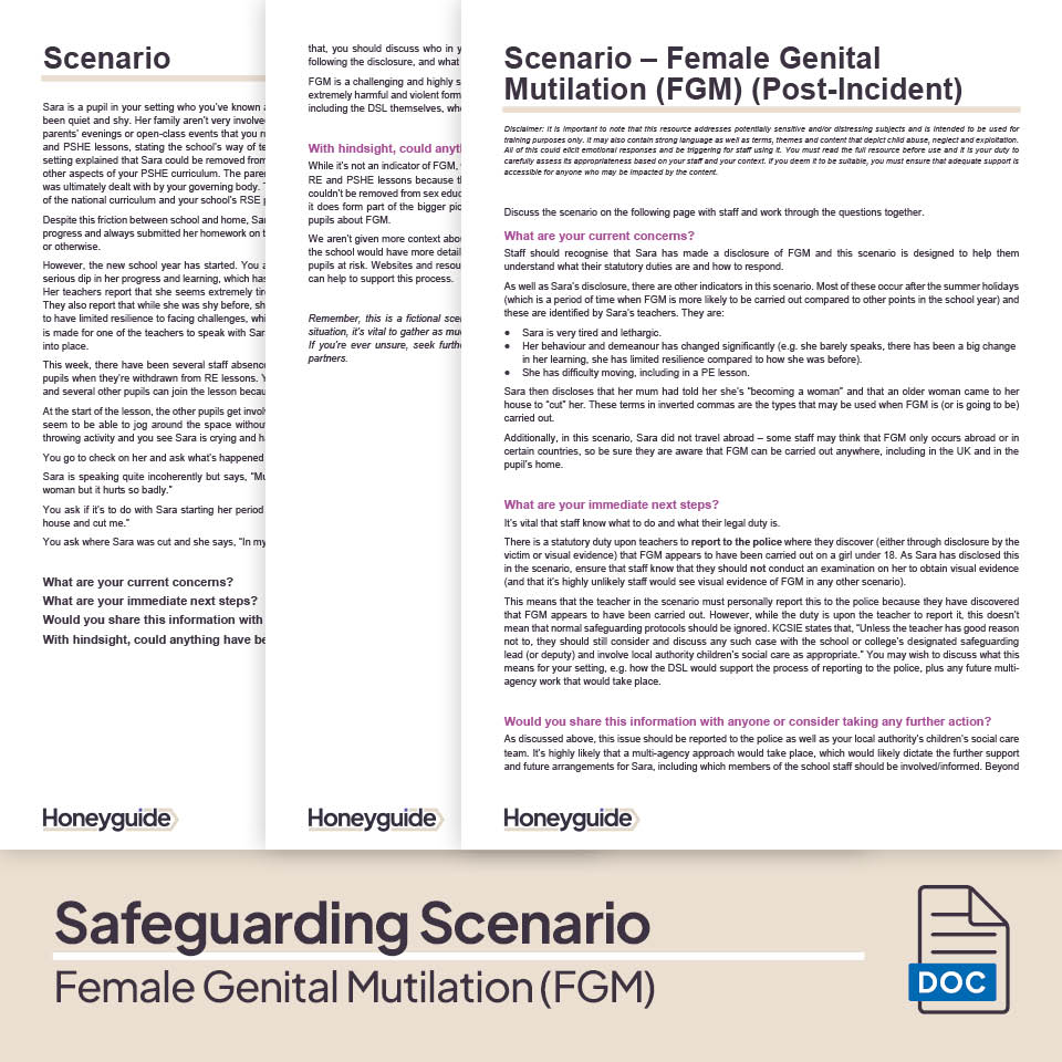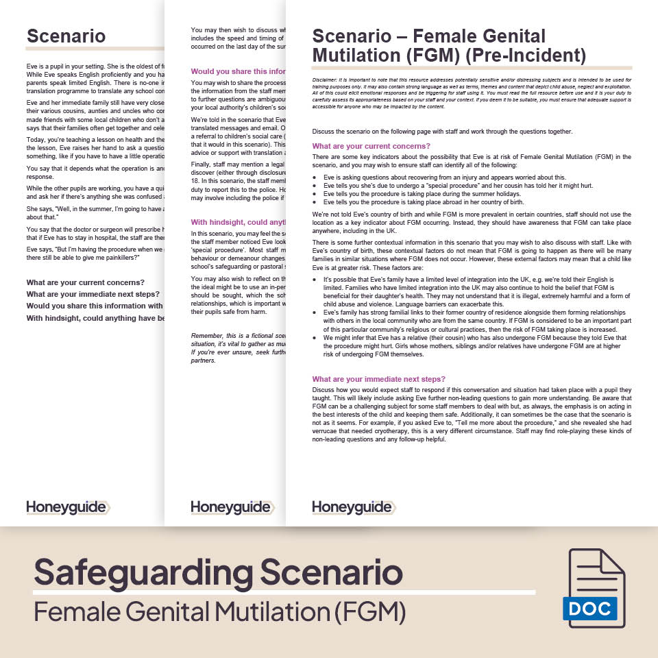 2. Scenarios - FGM (Pre-Incident) / FGM (Post-Incident): Two editable scenarios that outlines a fictional situations about FGM. It also includes full commentary and guided considerations for the DSL or staff member leading the child protection training. Use it to gauge how effectively staff can identify the signs of abuse as well as how they'd respond in a real-life context, including further actions they'd take. The post-incident scenario also helps staff understand their statutory duties to report incidents of FGM to the police.