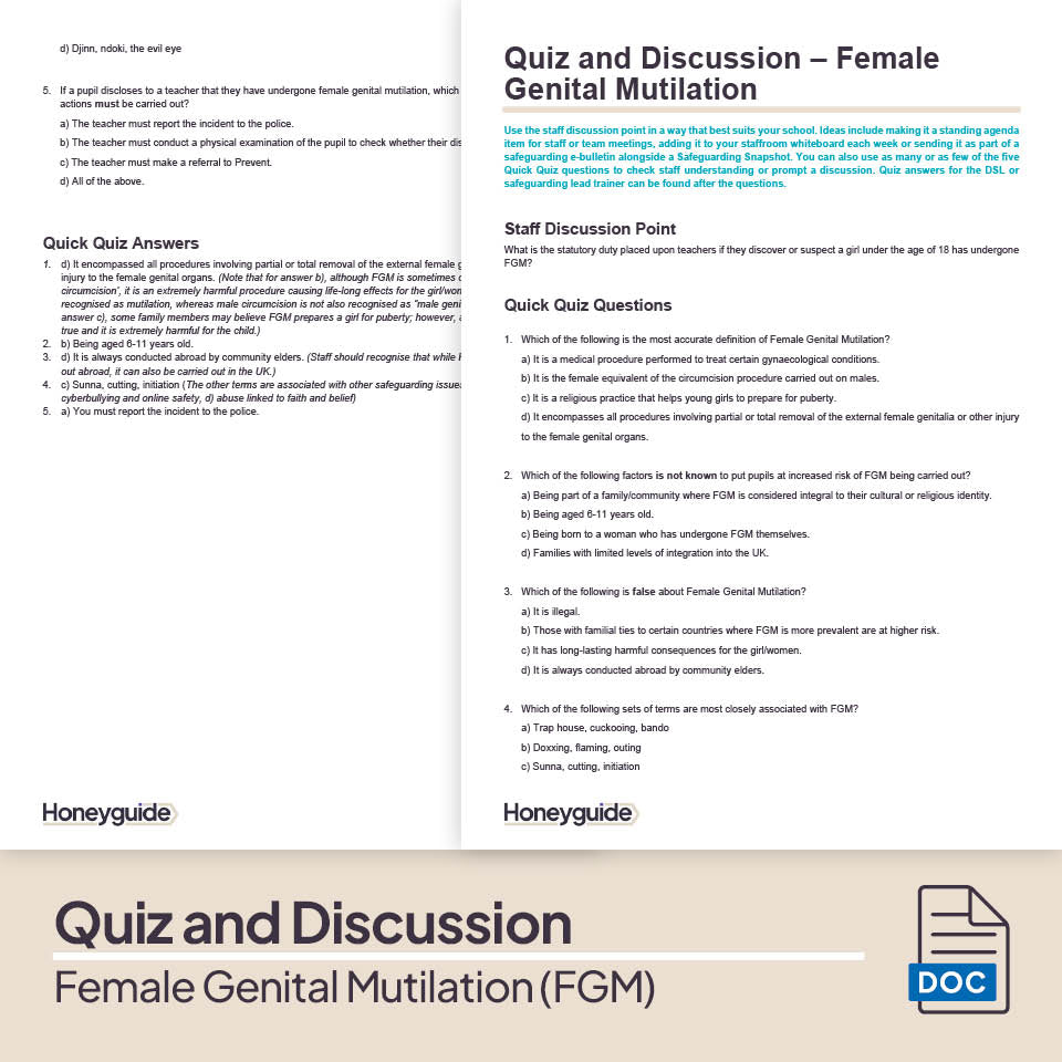 3. Quiz and Discussion - Female Genital Mutilation: There are five challenging multiple choice quiz questions that test your staff members' understanding of FGM, plus a discussion prompt that can be used to kickstart your training session or as a follow-up question a few weeks later.