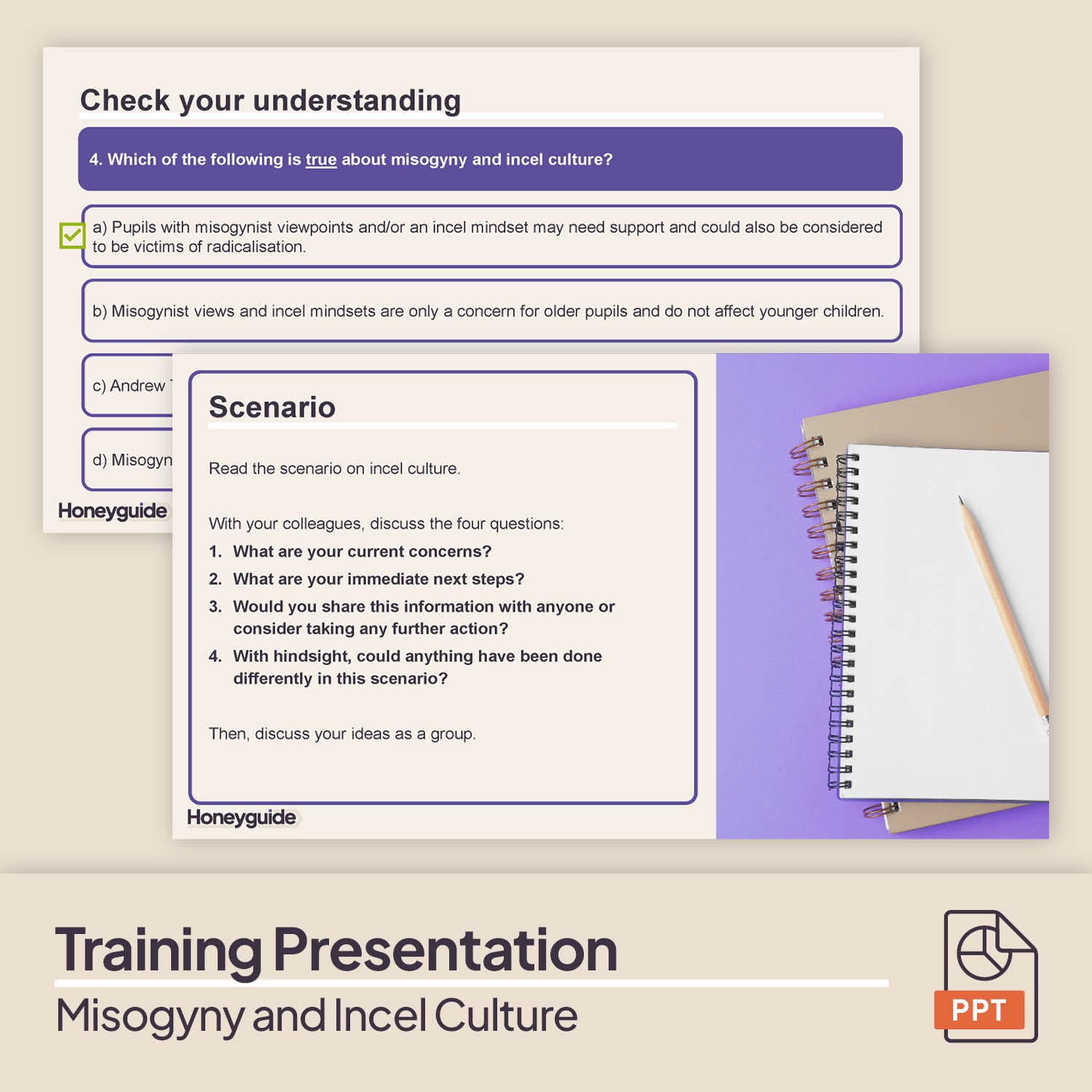 1. Staff Training Presentation - Misogyny and Incel Culture: A ready-to-deliver 26-slide PowerPoint presentation that outlines the key signs and indicators that a pupil has, or is developing, a misogynist mindset or is involved in the incel subculture. This includes key terminology that is used by incels, such as Chad, Stacy and bluepill, to build staff awareness in case pupils use them. This knowledge is followed by slides that allow staff to consider and discuss what puts pupils at greater risk, other factors to be aware of and what actions they should take. The presentation has built-in discussion questions and finishes with the accompanying scenario and a quiz to check staff understanding about incels and misogyny.
