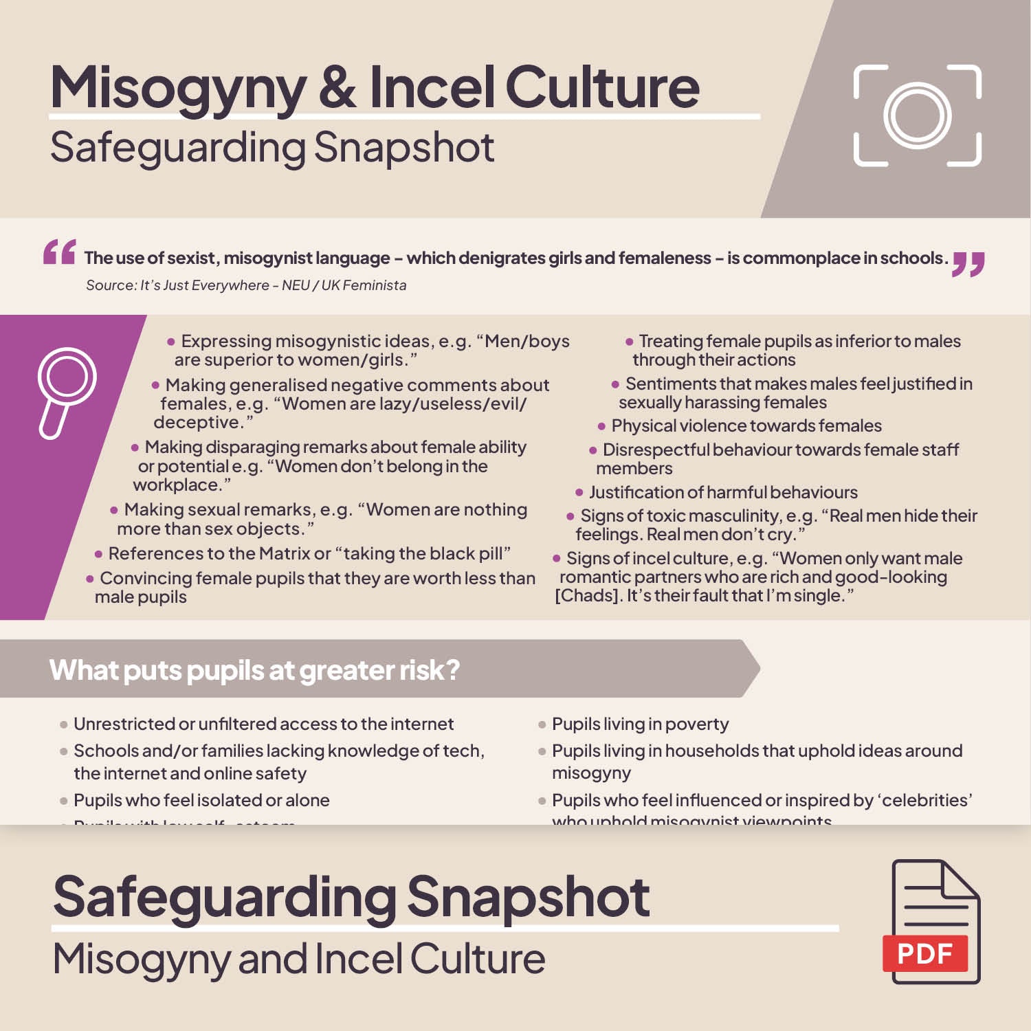 4. Safeguarding Snapshot - Misogyny and Incel Culture : This one-page, one-minute guide is perfect for following up the session by using as a training handout, displaying in your staff-only spaces or sending as part of a safeguarding e-bulletin.