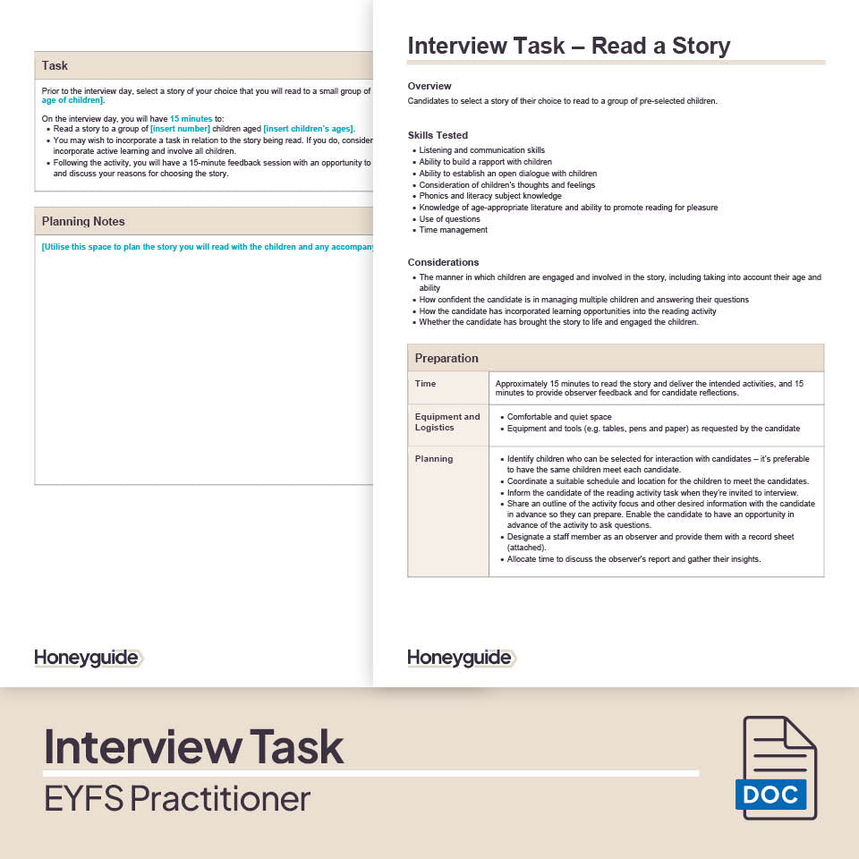 A pack with accompanying templates to help your school setting plan and prepare the interview day, including interview questions and tasks, when recruiting an early years practitioner. This pack contains guidance that allows you to consider the setup of the interview day itself, but if you're new to recruitment or want to ensure the entire recruitment process is smooth, you may find it help to purchase the Recruitment, Interview and Employment Compliance Guidance Pack alongside this interview pack.