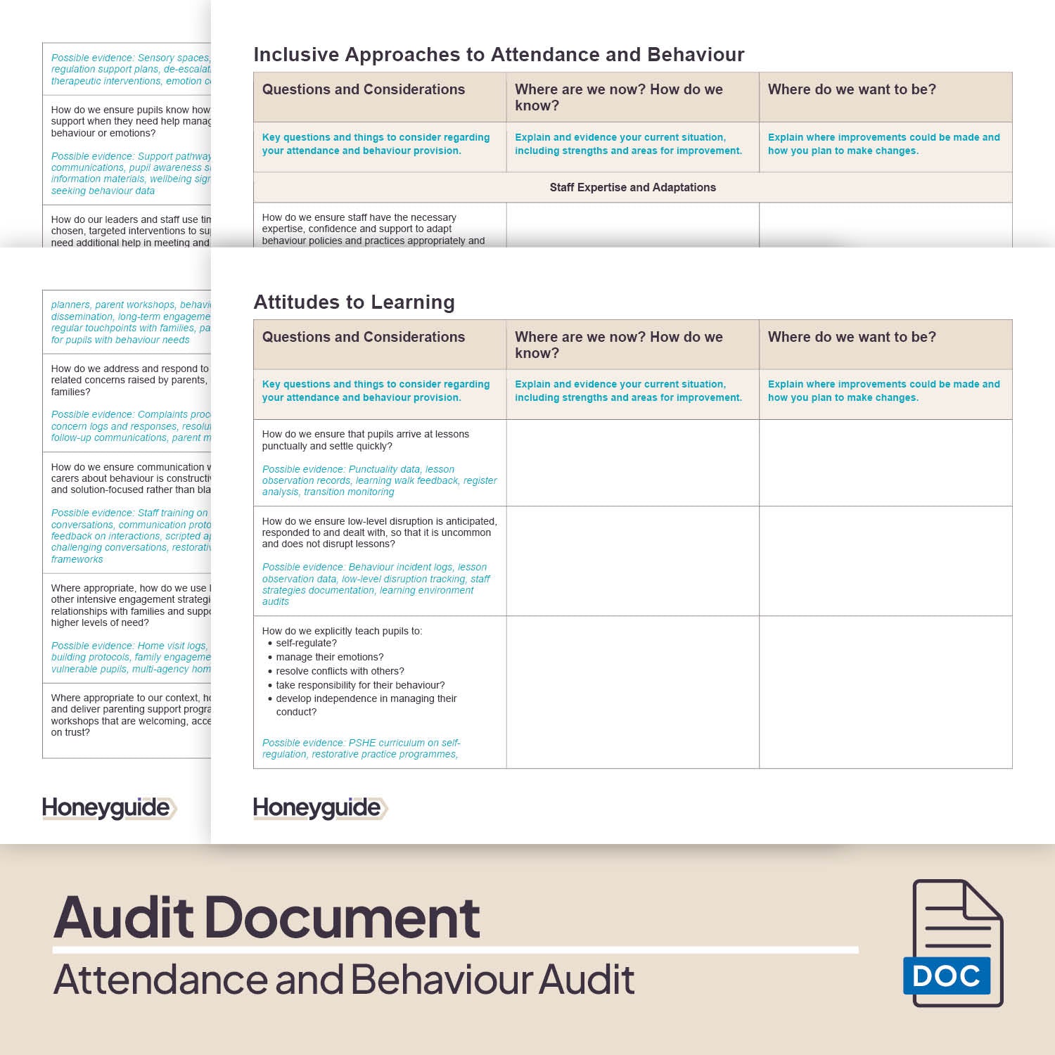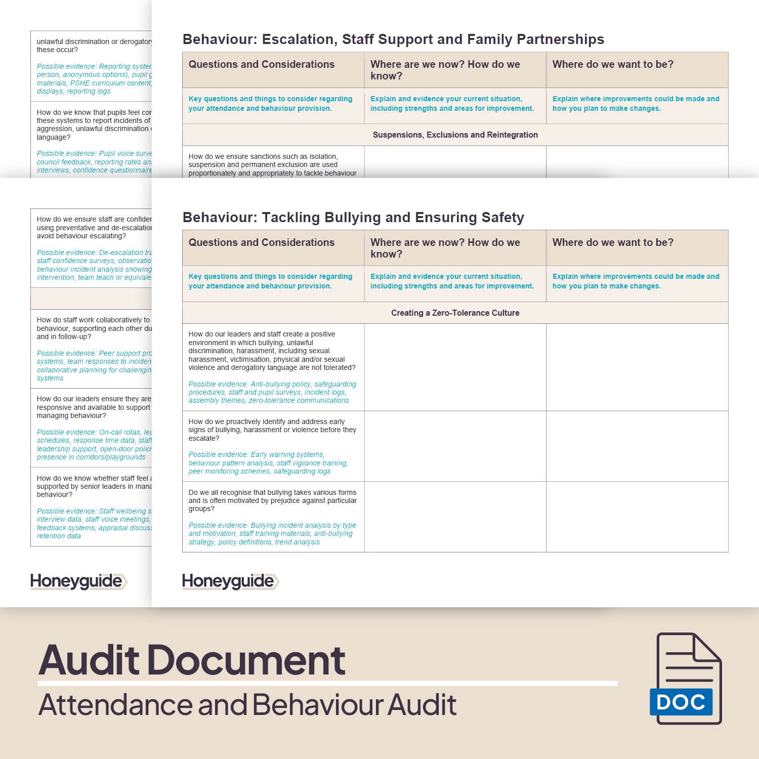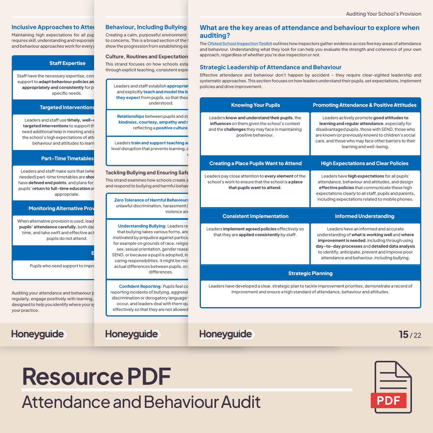 Specific audit sections focus on behaviour expectations, staff consistency, classroom routines and the day-to-day reality of behaviour management, helping you identify what's working and where practice varies.