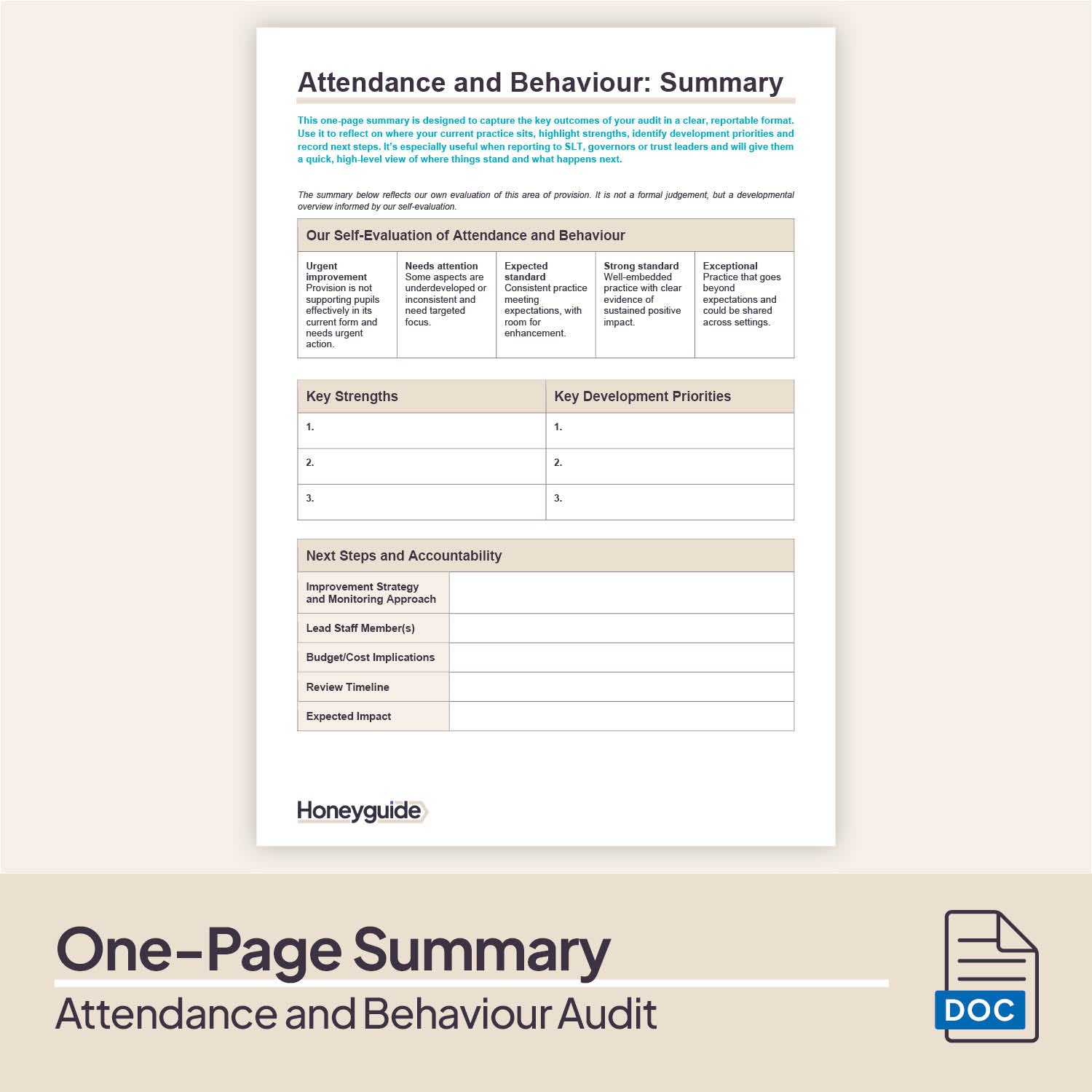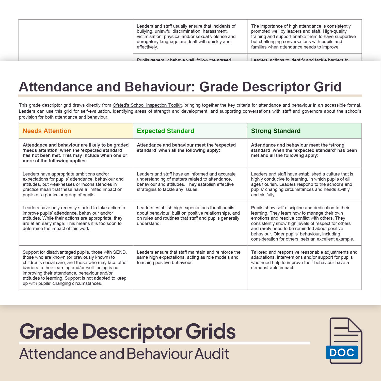 ☑️ Complete audit toolkit includes 22-page guidance document covering attendance and behaviour expectations and how to audit effectively, action plan template, attendance and behaviour evidence checklist, staff, pupil and parent question bank, and a one-page SLT/governor summary