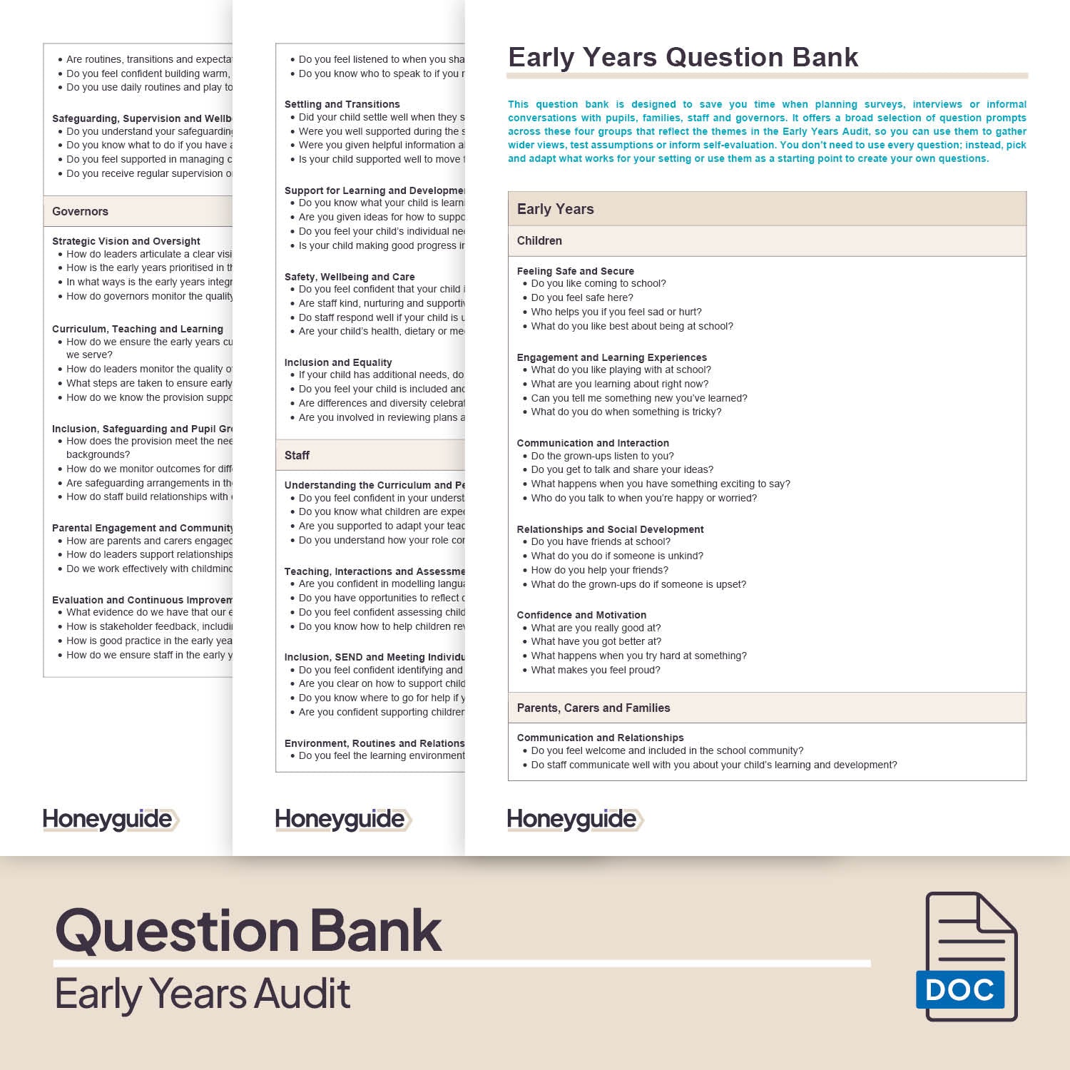 Editable questions to support EYFS-focused pupil voice, staff feedback, parent/carer engagement and governor scrutiny – ideal for triangulating evidence.