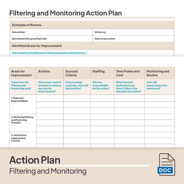 A 15-page fully editable audit document and accompanying action plan that's compliant with the latest safeguarding requirements around filtering and monitoring in KCSIE 2024. The resource guides you through key questions based on the following safeguarding themes: