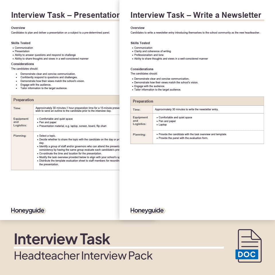 A pack with accompanying templates to help your school setting plan and prepare the interview day, including interview questions and tasks, when recruiting a headteacher. This pack contains concise guidance that allows you to consider the setup of the interview day itself, but if you're new to recruitment or want to ensure the entire recruitment process is smooth, you may find it help to purchase the Recruitment, Interview and Employment Compliance Guidance Pack alongside this interview pack.