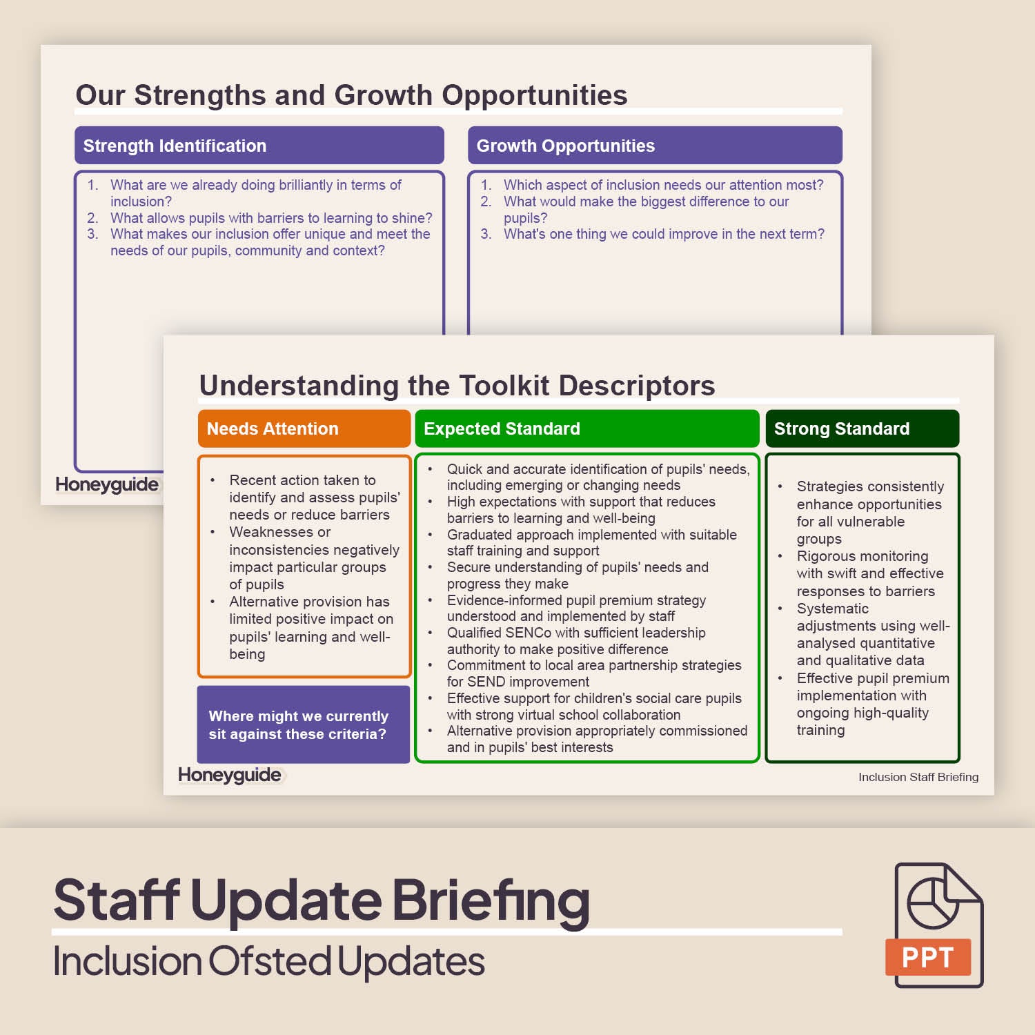 How can I update staff on Ofsted's new Inclusion requirements? Use the 22-slide briefing PowerPoint to run structured staff meetings or INSET sessions that explain the changes clearly and practically.