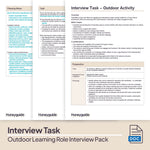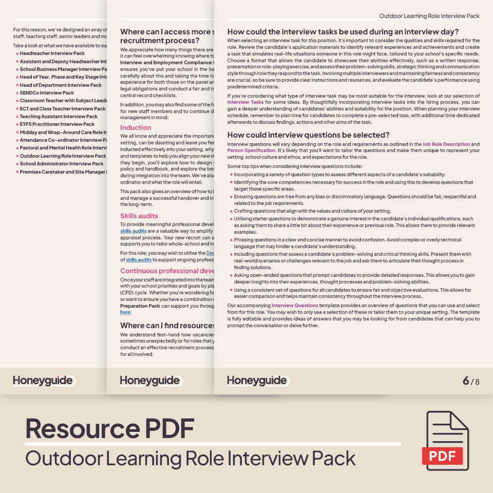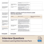 A pack with accompanying templates to help your school setting plan and prepare the interview day, including interview questions and tasks, when recruiting an outdoor learning lead or assistant. This pack contains some guidance that allows you to consider the setup of the interview day itself, but if you're new to recruitment or want to ensure the entire recruitment process is smooth, you may find it help to purchase the Recruitment, Interview and Employment Compliance Guidance Pack alongside this interview pack.