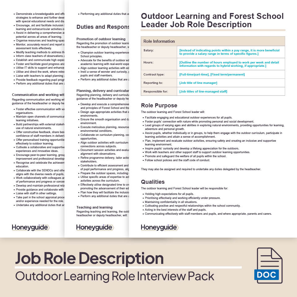 While the pack is tailored towards appointing a new outdoor learning teacher or Forest School lead, it can be used to support the recruitment process for any job role where the employee will lead or support outdoor learning in your school, including a Forest School teacher, outdoor learning assistant, outdoor education teacher, Forest School practitioner or a teacher / teaching assistant with outdoor learning leadership responsibilities.