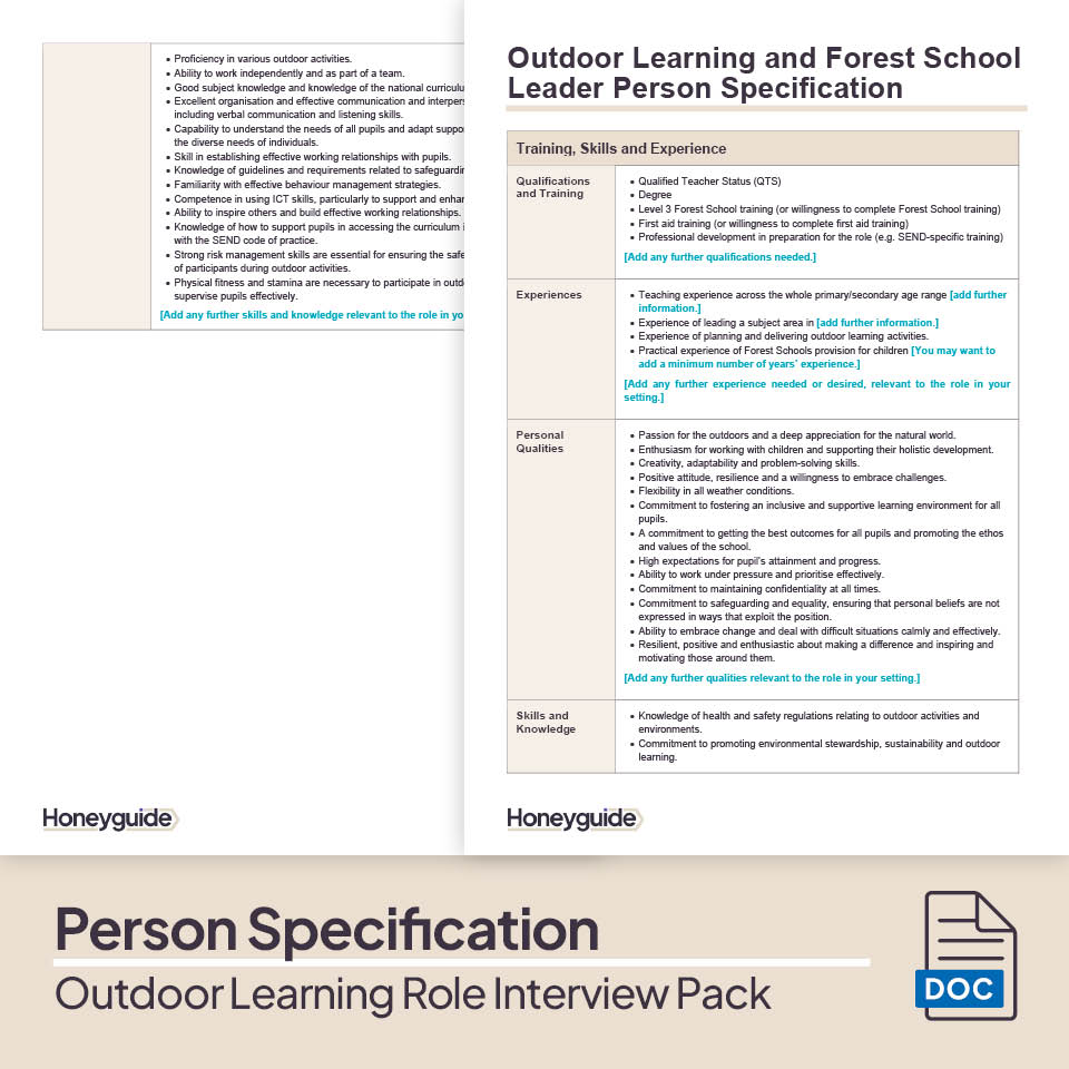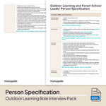 Included in this outdoor learning and Forest School leader interview pack is an editable interview tasks plus a wide variety of example interview questions and answers so you can find a brilliant outdoor learning teacher for your school. The job description and person specification for will also support you in advertising for a new Forest School teacher or outdoor learning leader so you attract the right candidates. Use these, alongside the interview tasks and outdoor learning role interview questions to create a recruitment package that's tailored to exactly what your school is looking for in a new Forest School lead or outdoor learning teacher.