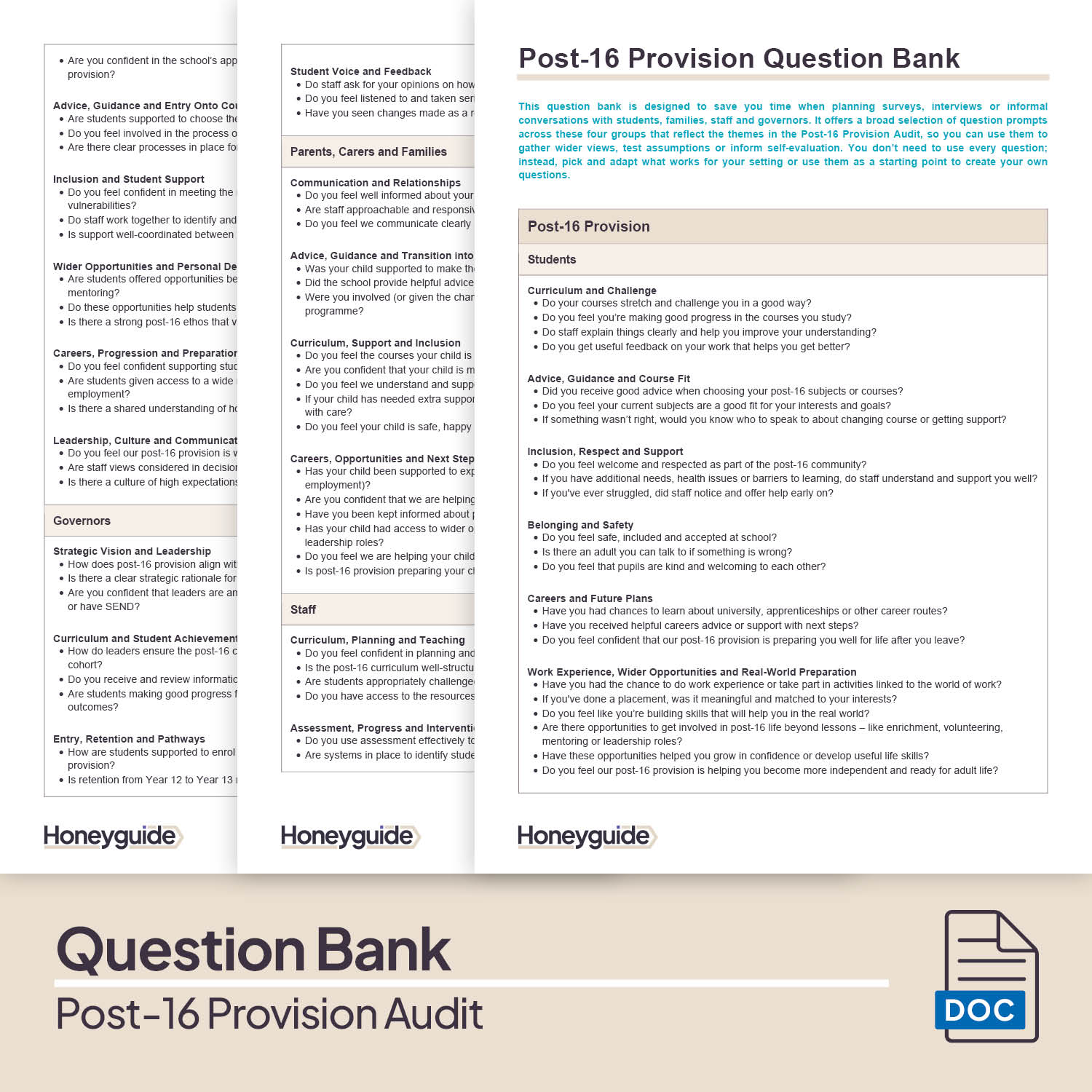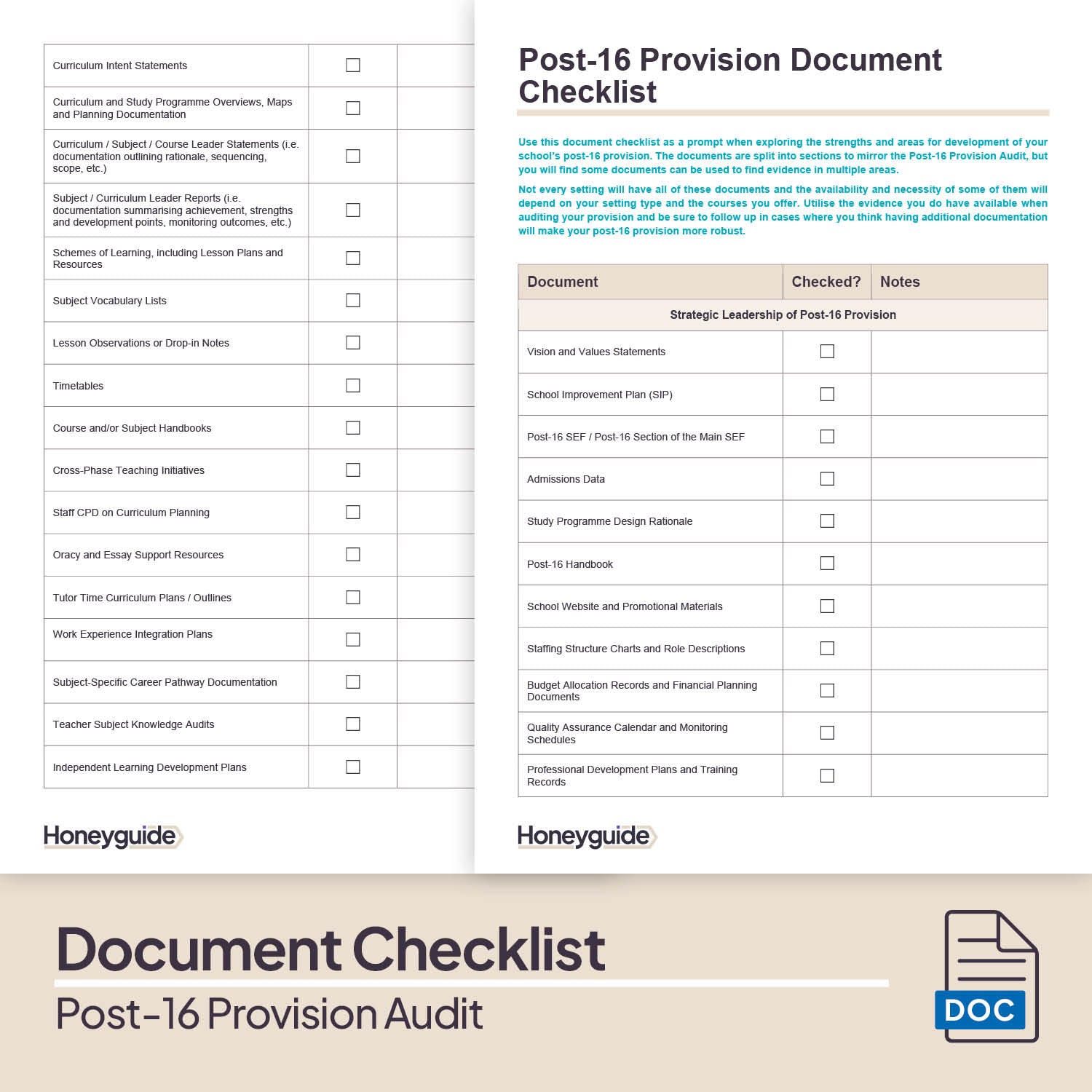 ☑️ Complete audit support toolkit including post-16 action plan, document checklist, question bank, and one-page summary to support planning and quality assurance