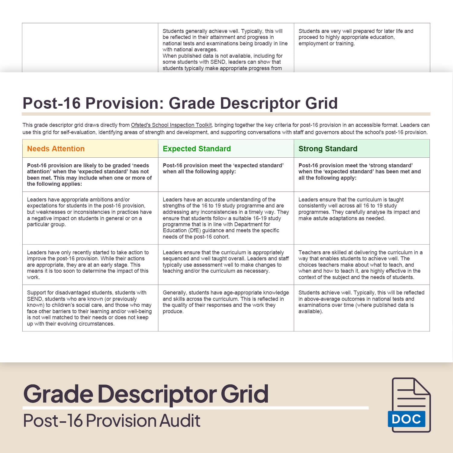 ☑️ Comprehensive 33-page post-16 audit document with detailed prompts across 7 key sections, including strategic leadership, achievement, curriculum and teaching, preparation for next steps, and inclusive practices