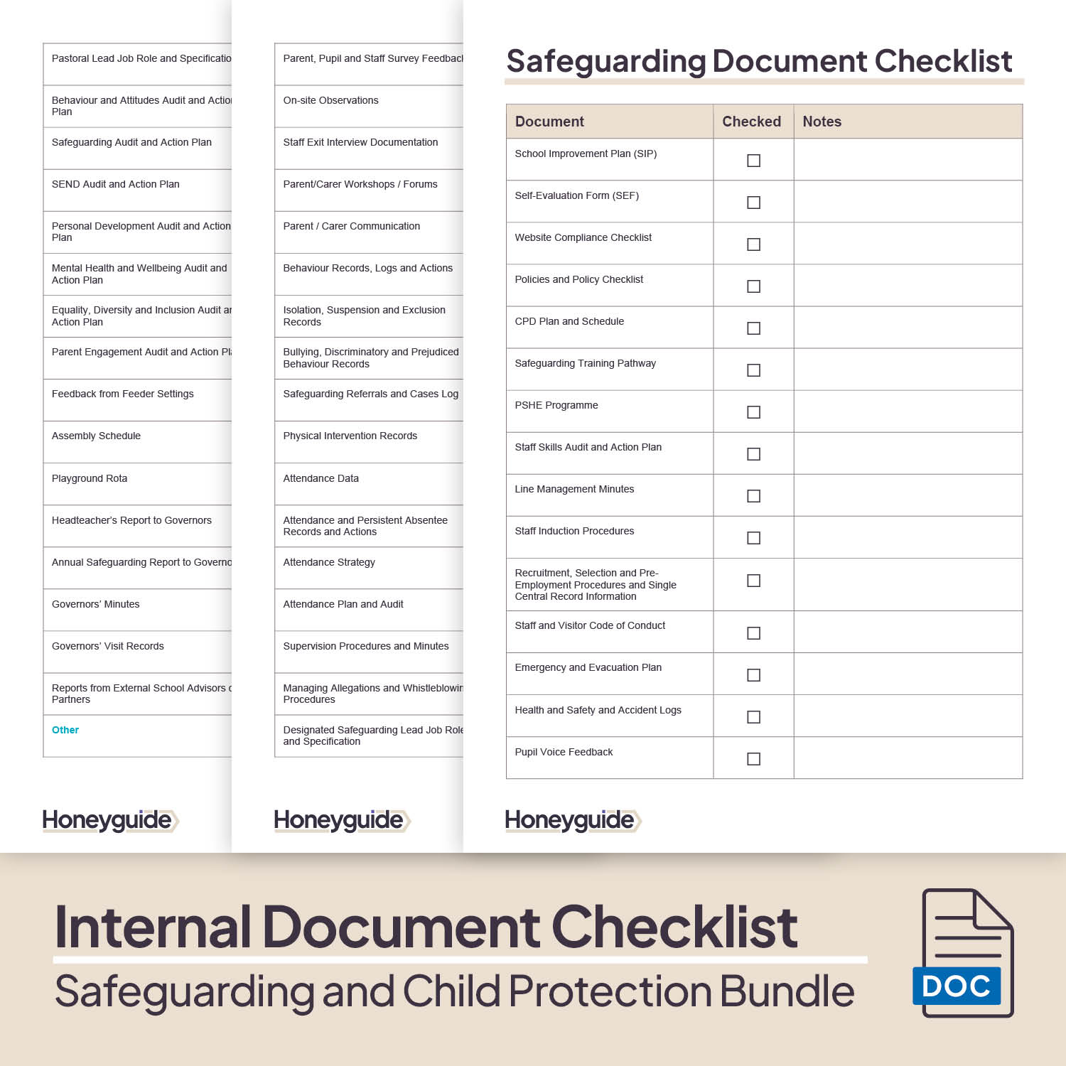 The key difference between these two Honeyguide packs is this safeguarding deep dive bundle will give you a snapshot view of child protection at the time when you carry it out and is designed to mirror what Ofsted will do when they look at safeguarding in your school. For example, you may discover a missing entry on your SCR or that there are some staff misconceptions around how to report safeguarding concerns. Just like in an Ofsted inspection, when gathered together, these snippets of information give a picture of the culture of safeguarding in your school and can be used as part of a checking / quality assurance process.