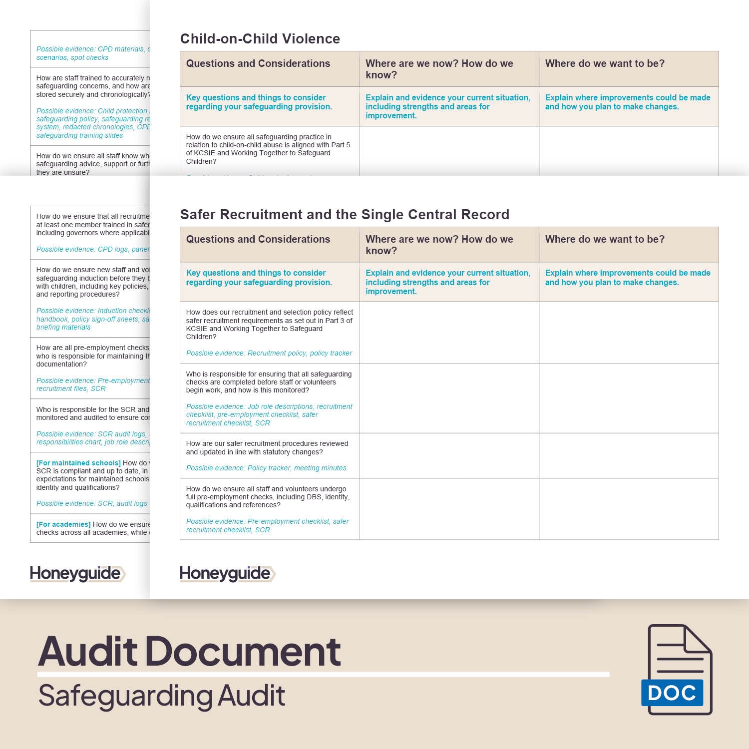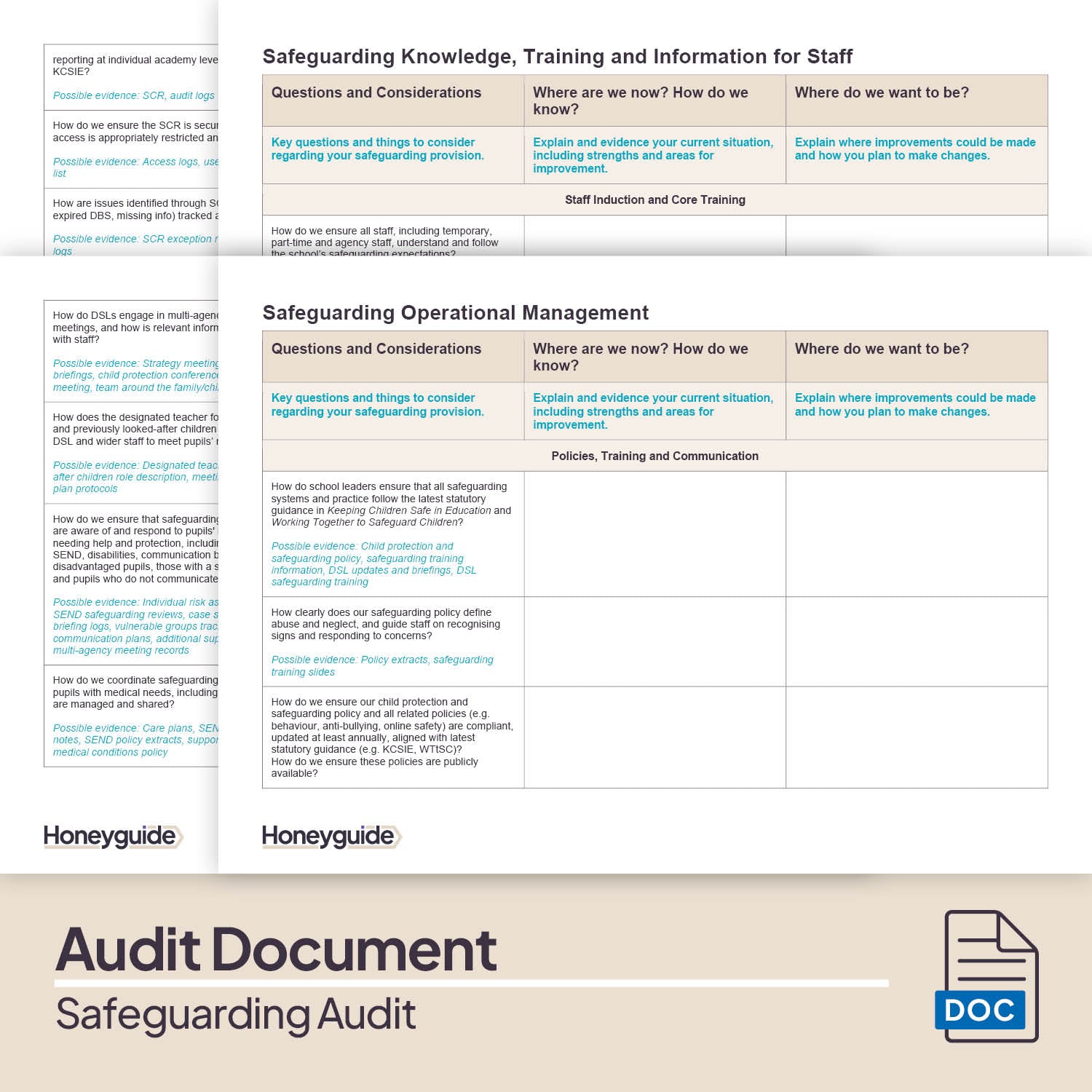 ☑️ Complete 46-page safeguarding audit document covering strategic leadership, operational management, staff training, safer recruitment, child-on-child violence, site safety and continuous improvement, with structured questions and evidence prompts to evaluate current provision and identify next steps