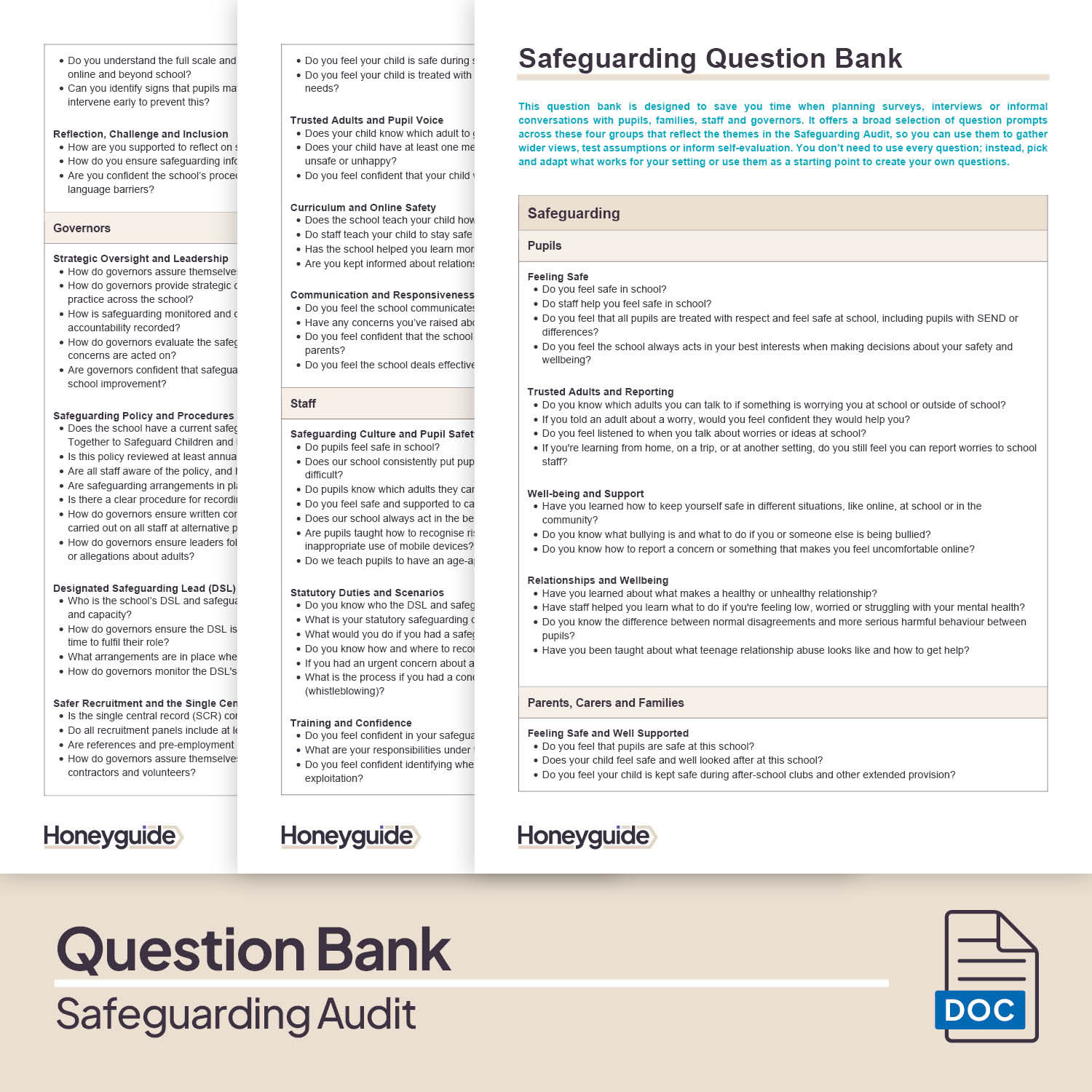 Editable questions to support safeguarding-focused pupil voice, staff feedback, parent/carer engagement and governor scrutiny – ideal for triangulating evidence on culture, practice and impact.