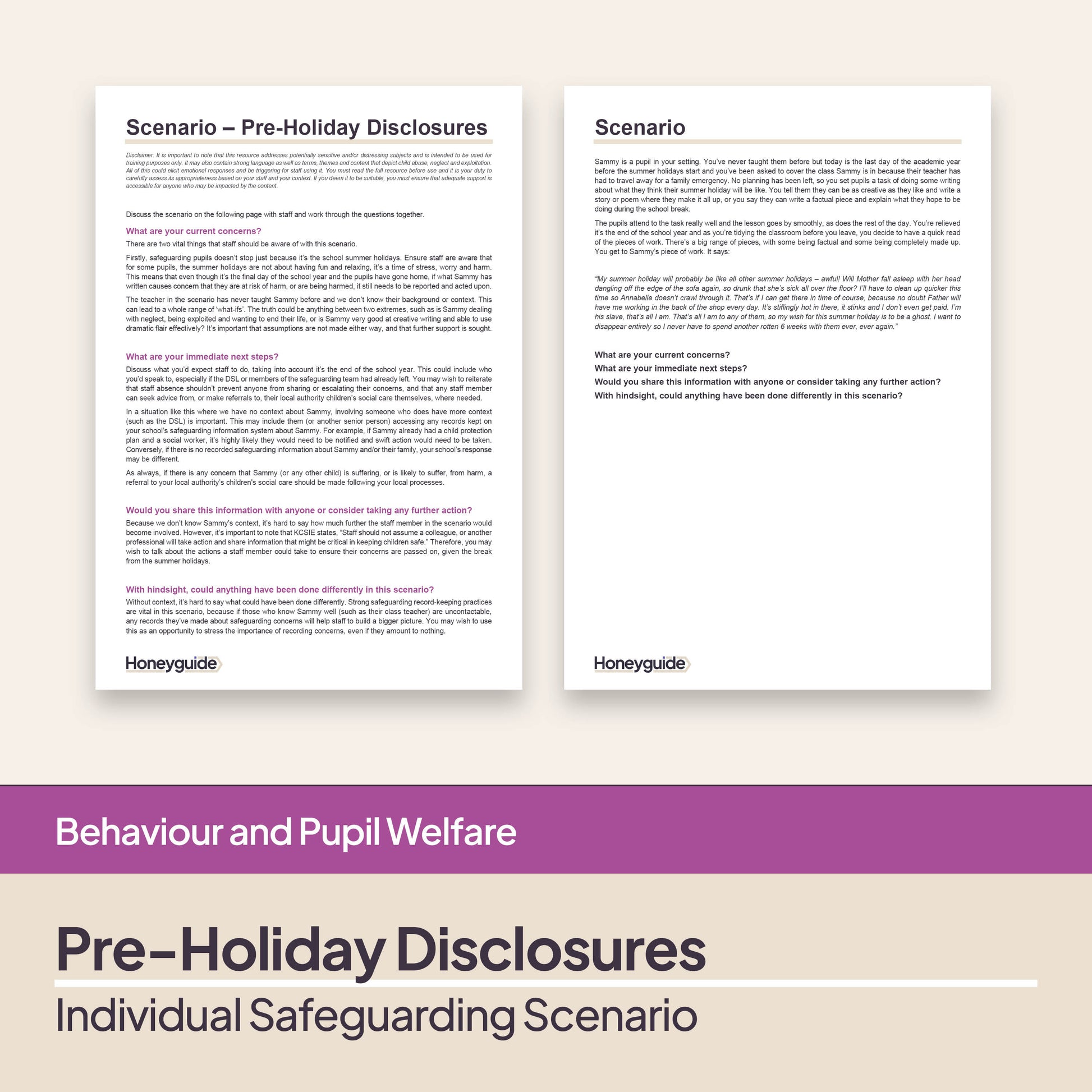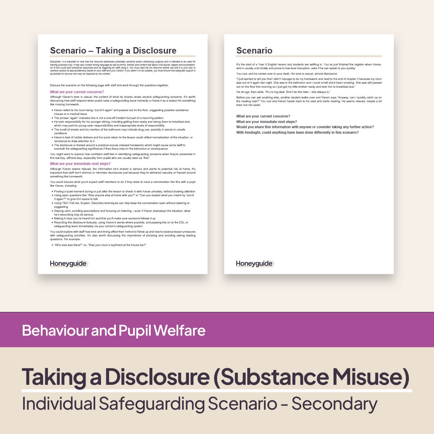 This set explores key moments in safeguarding practice, including how to handle pre-holiday disclosures, respond to concerns about physical abuse, and manage disclosures involving parental substance misuse. Each scenario can be used flexibly in staff meetings or training to reinforce professional responsibilities and build staff confidence.