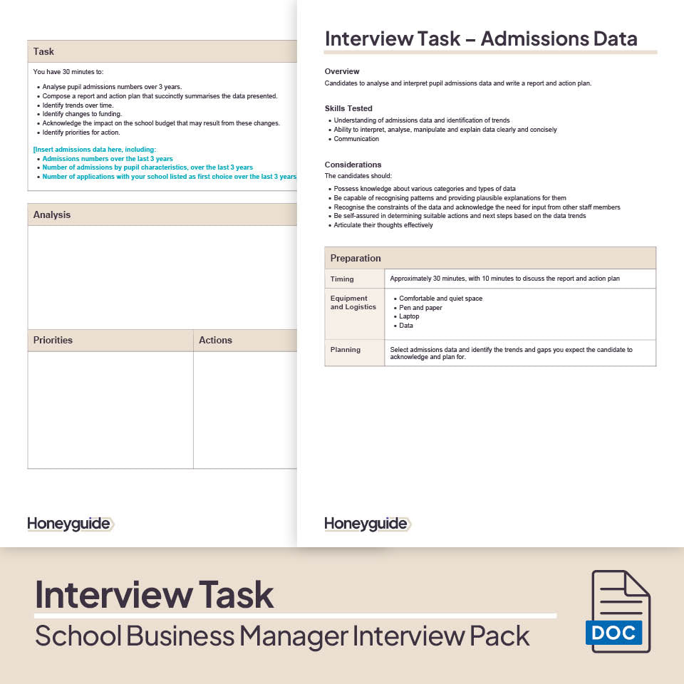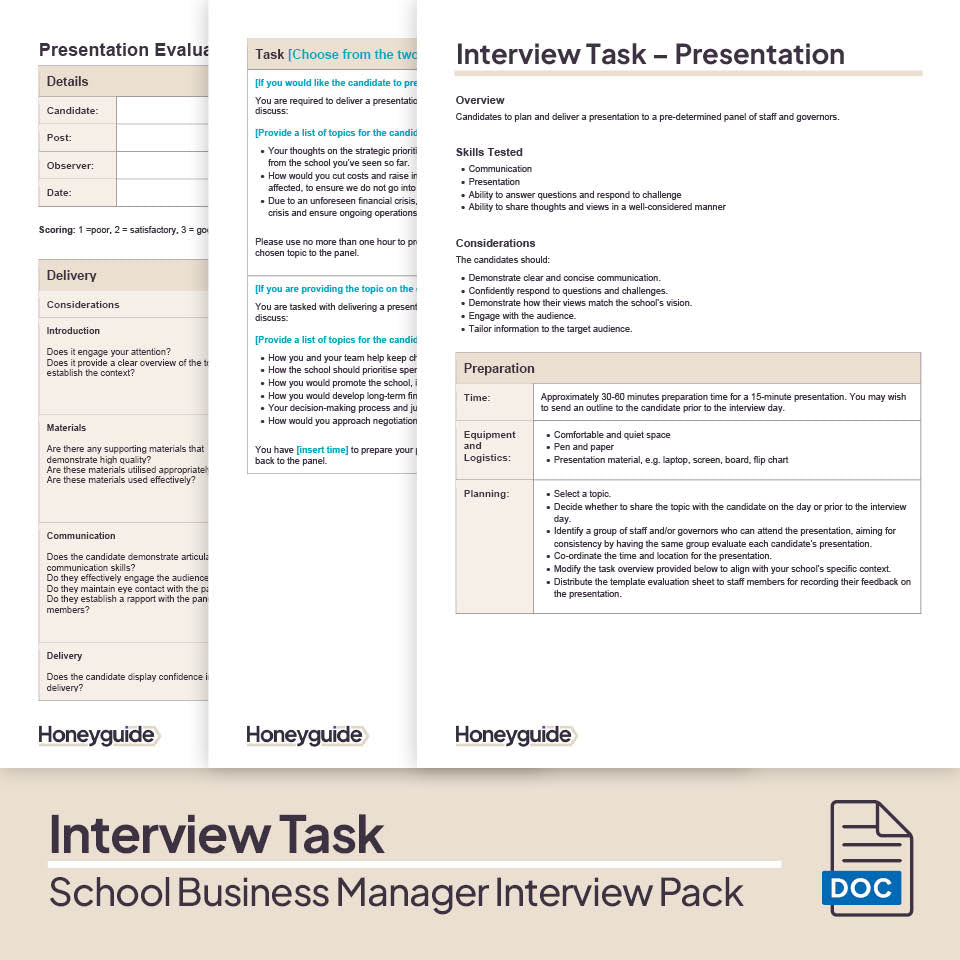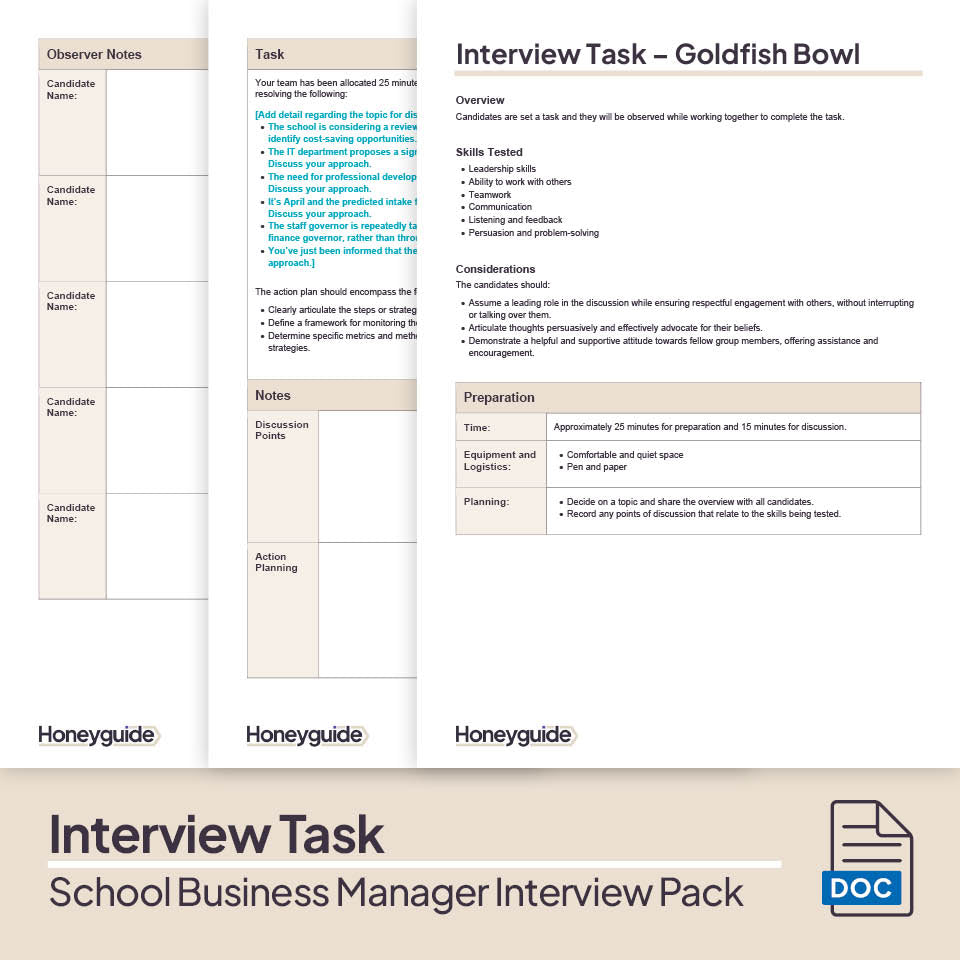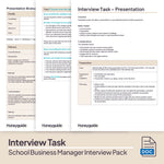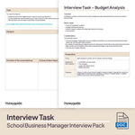 A pack with accompanying templates to help your school setting plan and prepare the interview day, including interview questions and tasks, when recruiting a SBM, school finance manager, bursar or similar. This pack contains shortened guidance that allows you to consider the setup of the interview day itself, but if you're new to recruitment or want to ensure the entire recruitment process is smooth, you may find it help to purchase the Recruitment, Interview and Employment Compliance Guidance Pack alongside this interview pack.